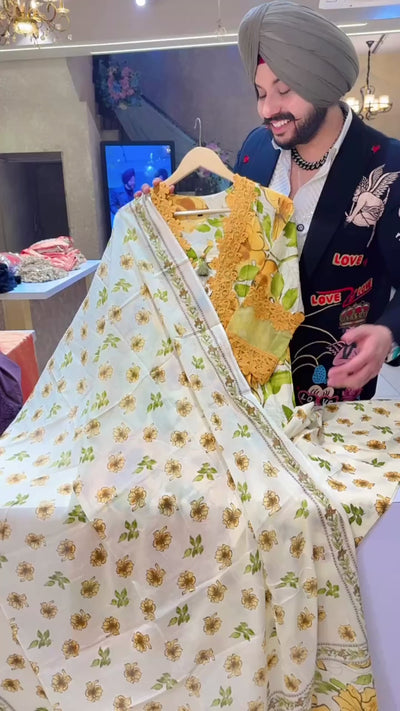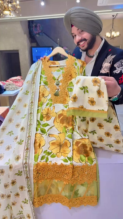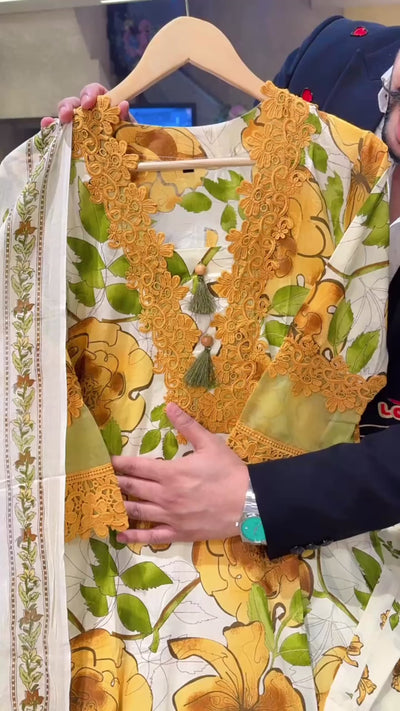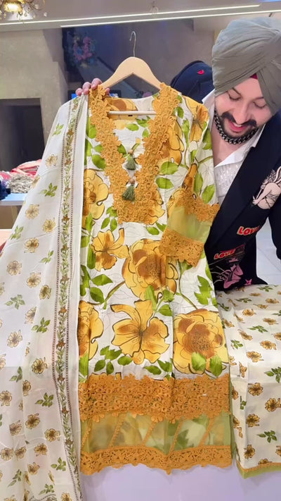 Cream & Mustard Yellow Crochet Lace Kashmiri Cotton Suit with Beautiful Duppata