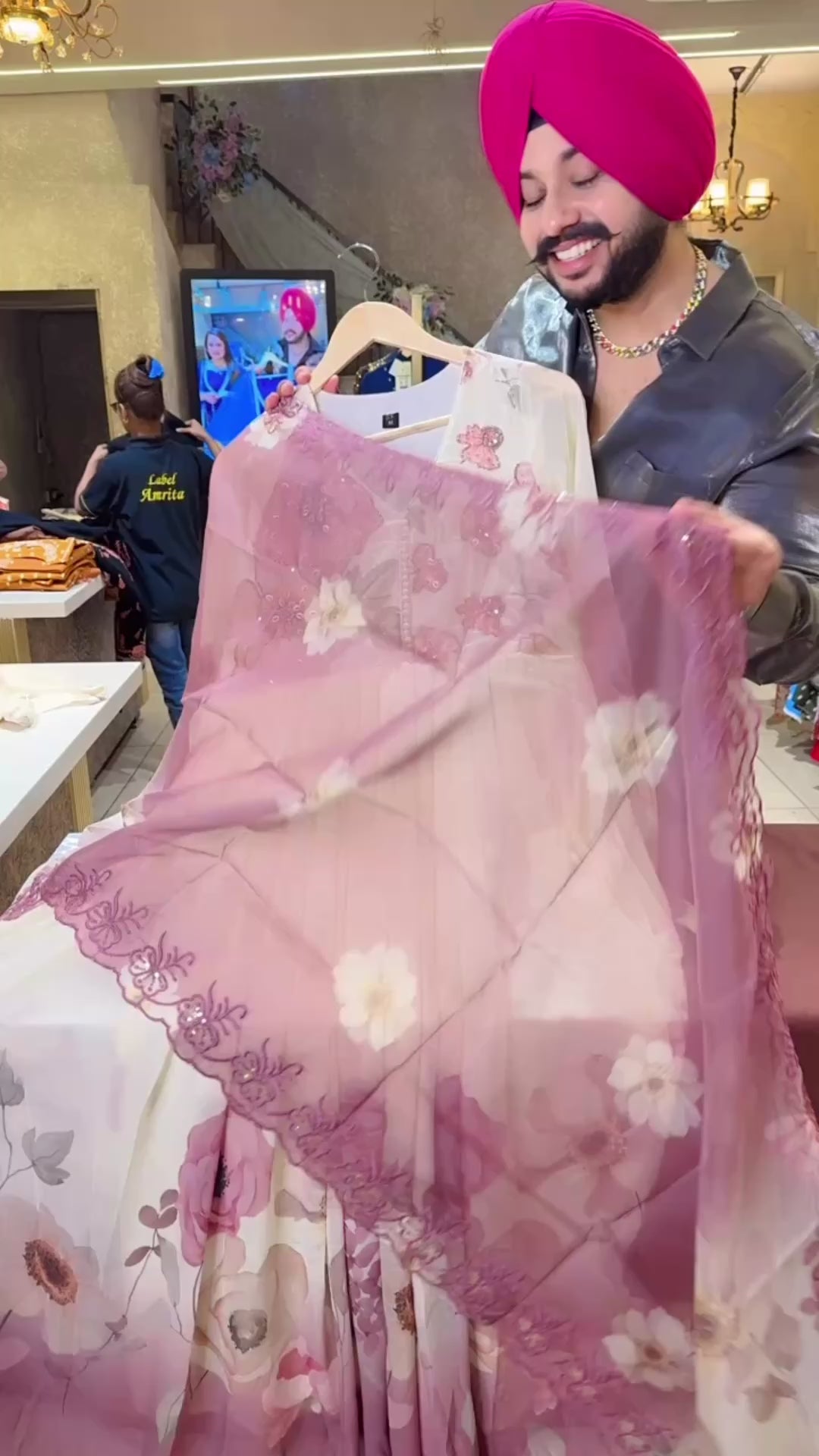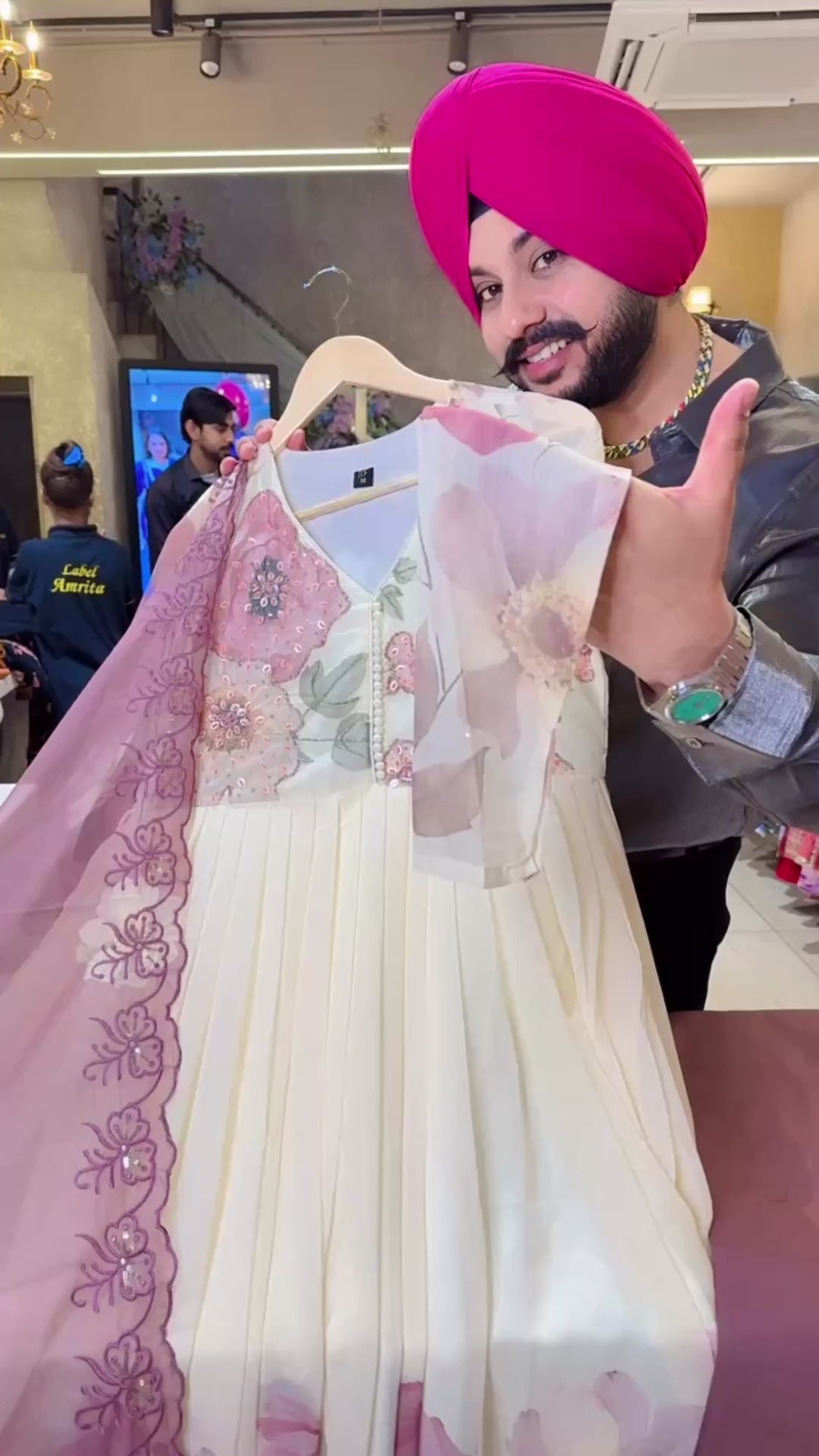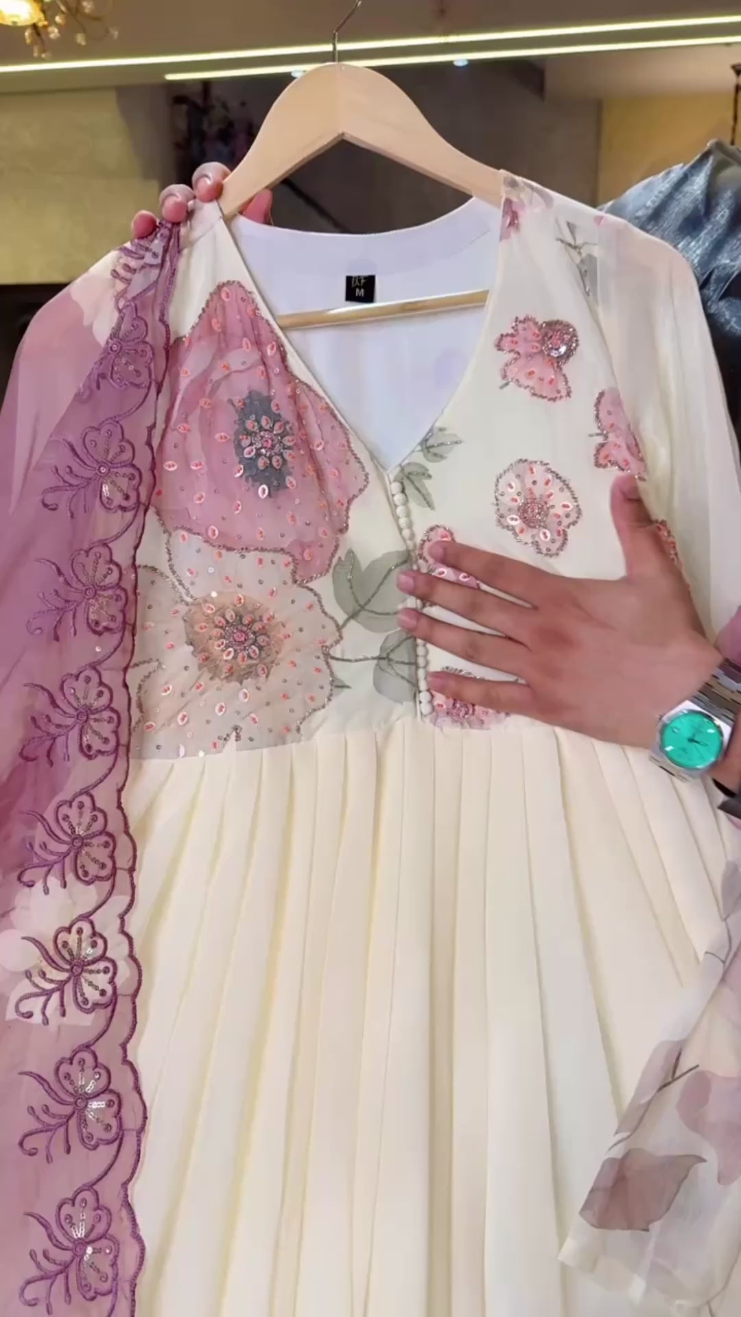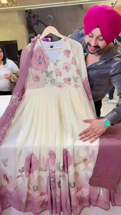 Cream & onion Chiffon Floral print Full Flair Anarkali Suit with Hand Embroidery work on neck & Organza Duppata