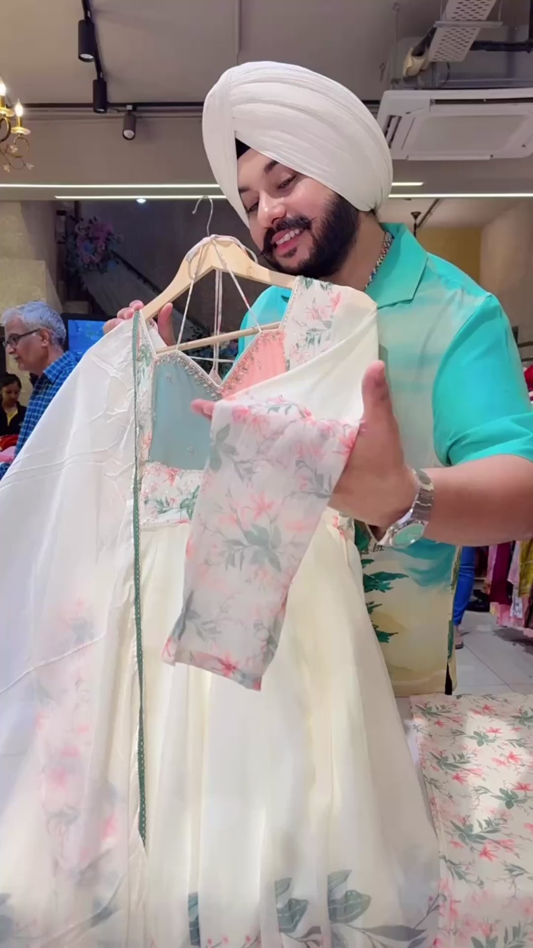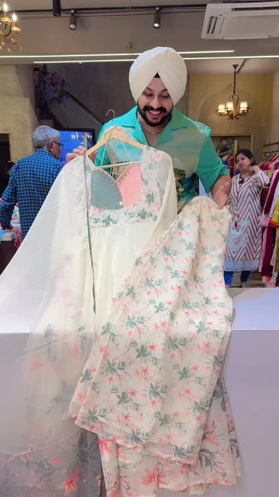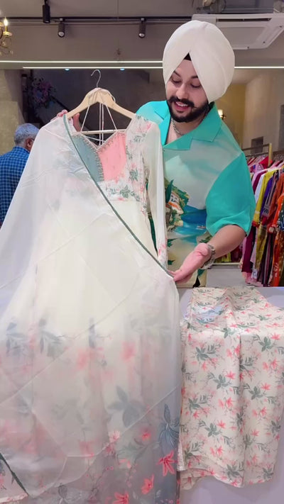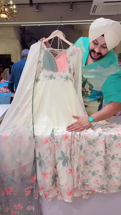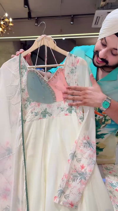 Cream & Pastel Multicolored Soft Chiffon Girlish Halter Neck Semi Backless Anarkali Suit with Beautiful Hand embroidery Work on Neck