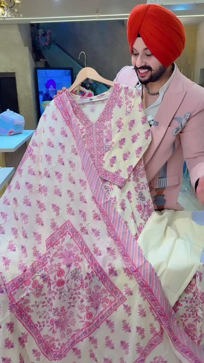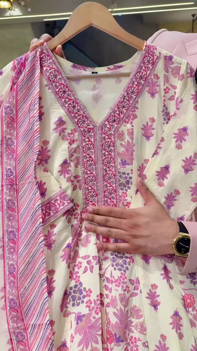 Cream & Pink Pure Cotton Floral Print Office Wear Anarkali Suit with Hand embroidery Work on Neck