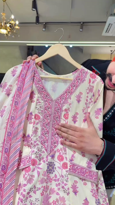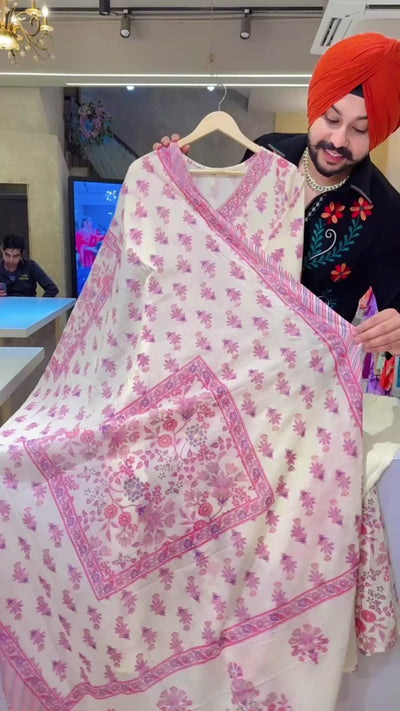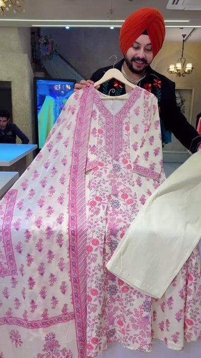 Cream & Pink Pure Cotton Floral Print Office Wear Anarkali Suit with Hand embroidery Work on Neck