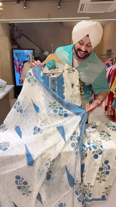 Cream & Powder Blue pure Cotton Crochet Laces premium Straight Suit