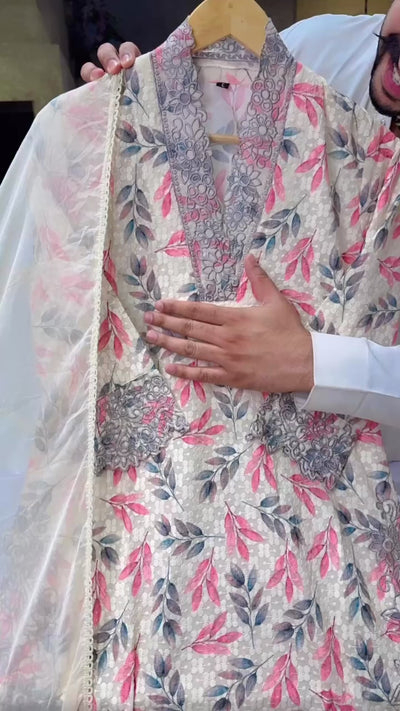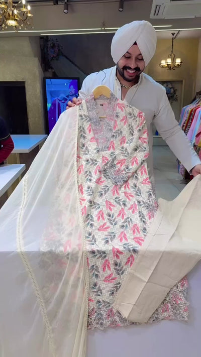 Cream Pure Cotton Self Embroidered & Cut Work Office Wear Suit with Stiff Cotton Light Beige Pants & Chiffon Duppata