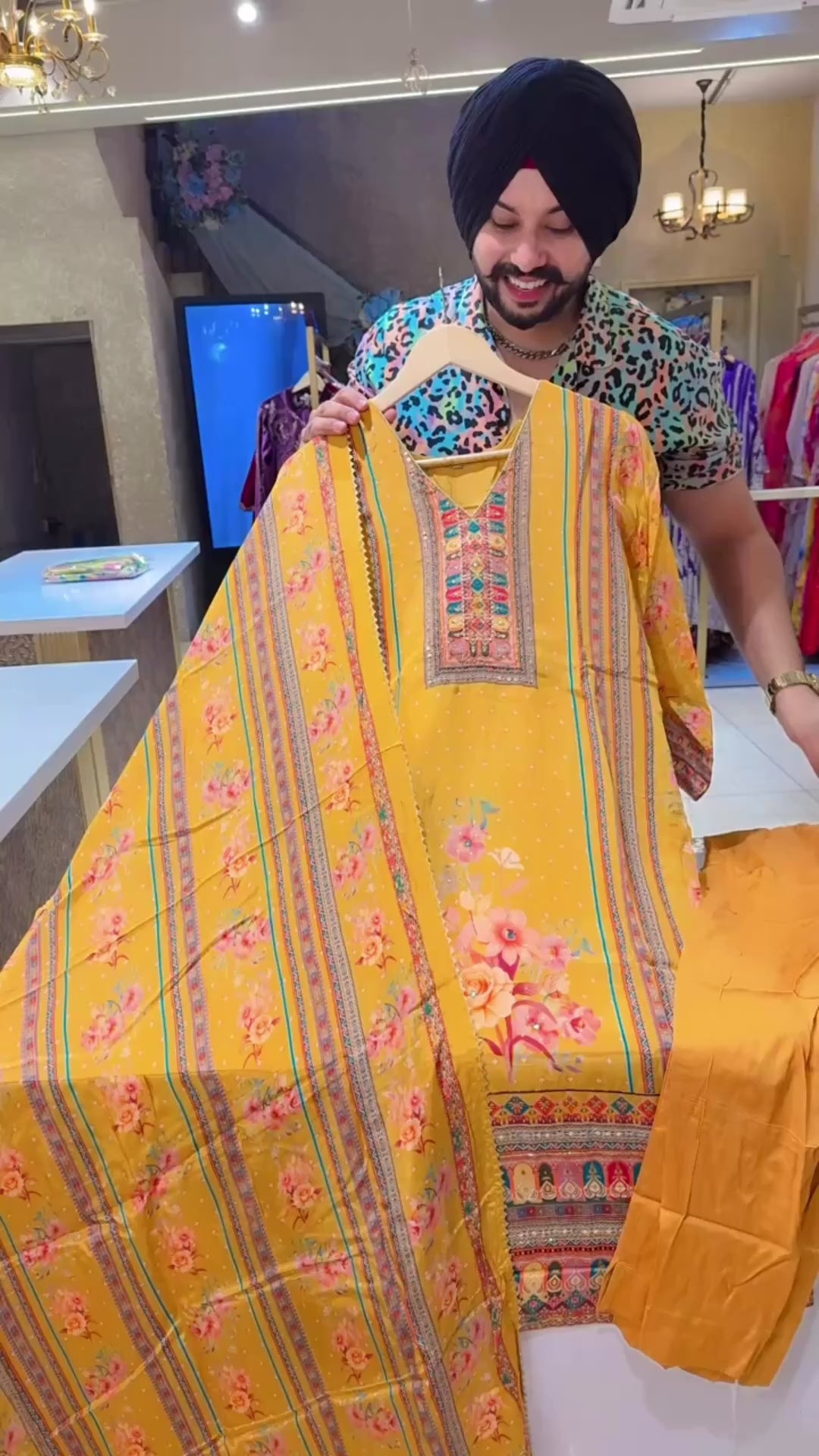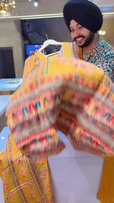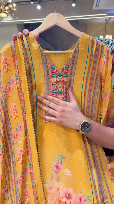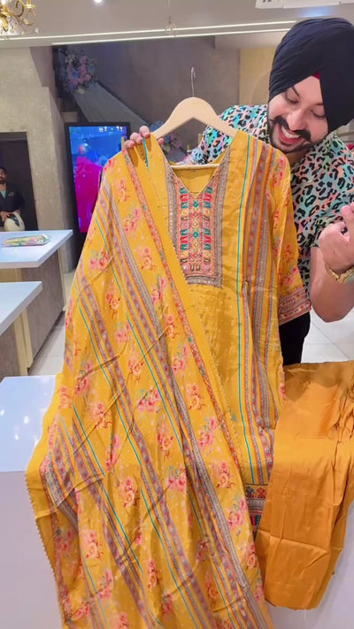 Mustard yellow Crepe digital Print party Wear Suit with Hand embroidery Work on neck