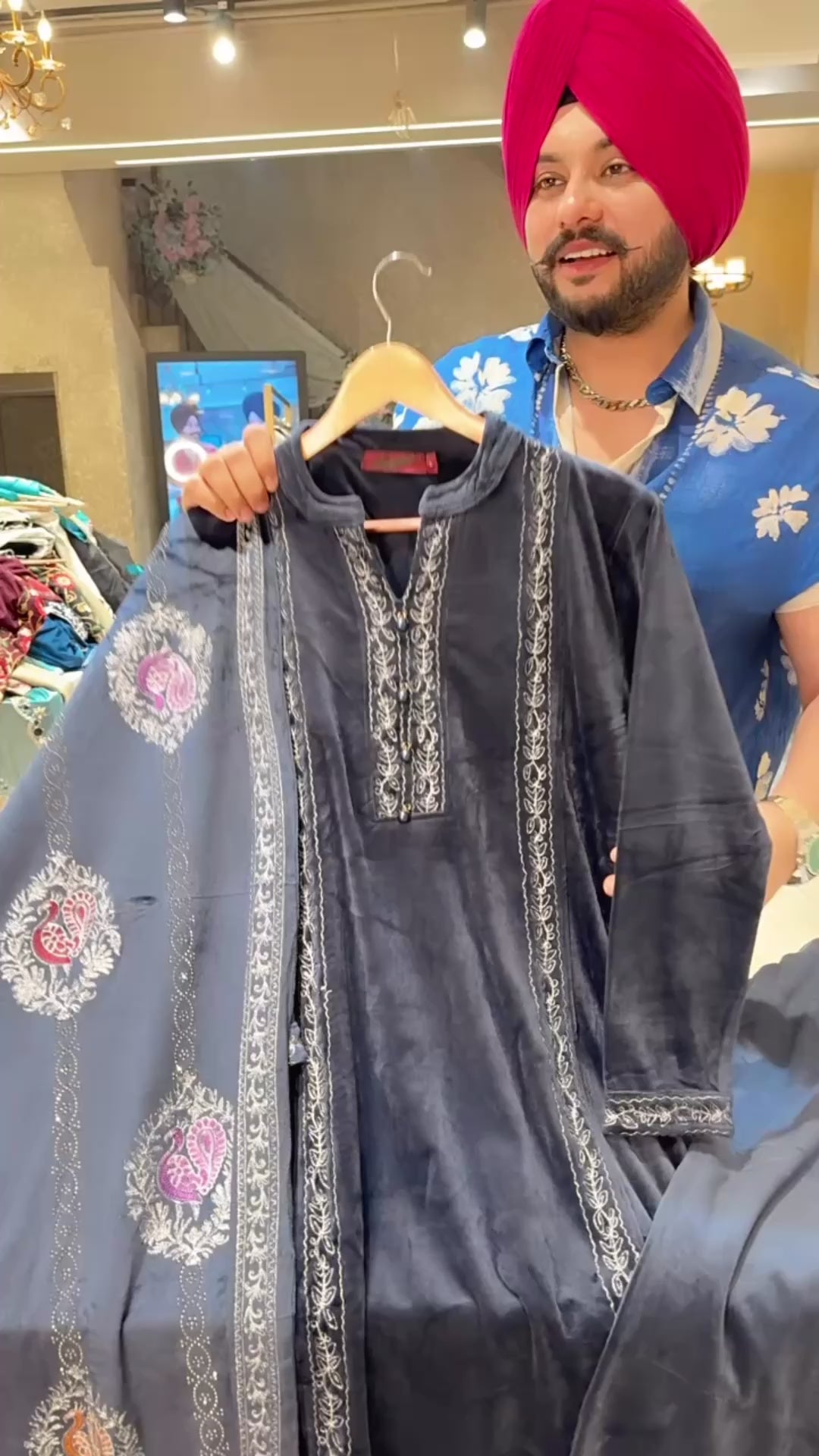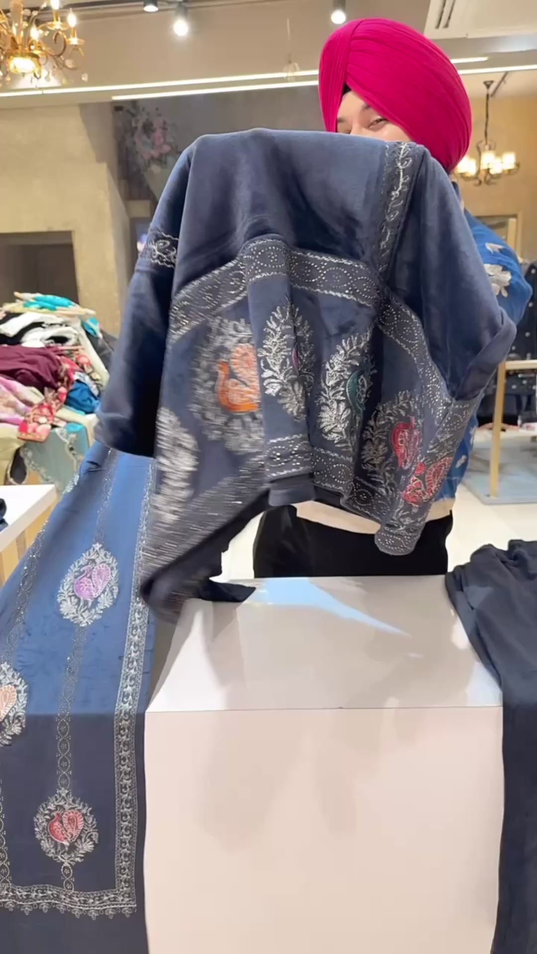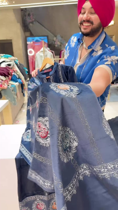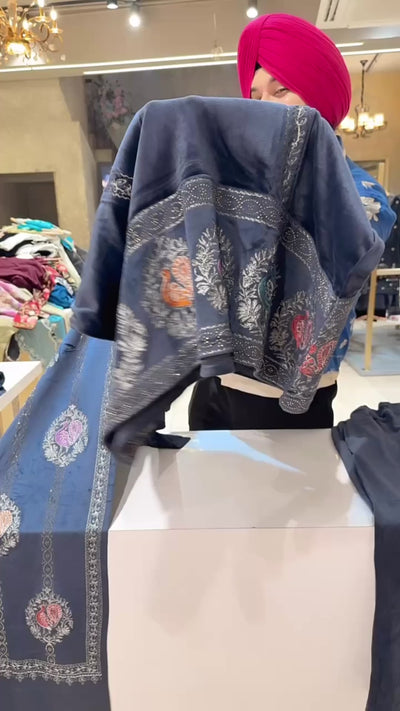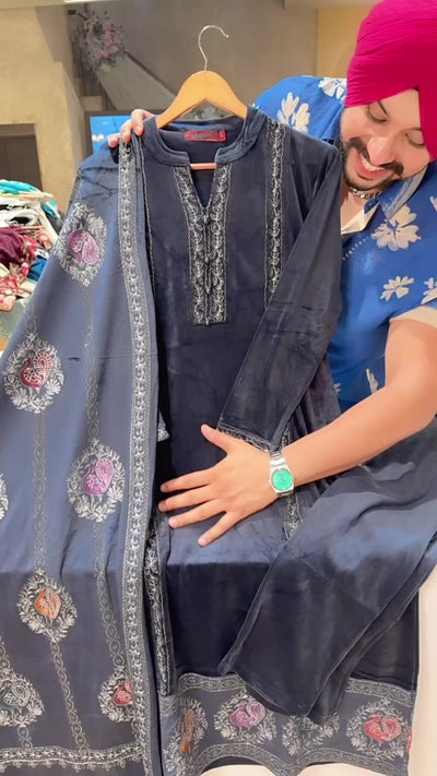 Dark Blue Matt Velvet party wear A-line Suit with heavy embroidered Duppata