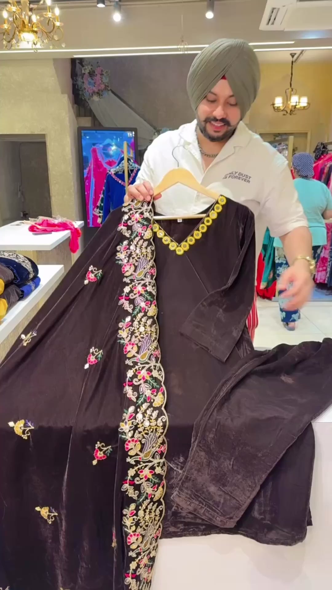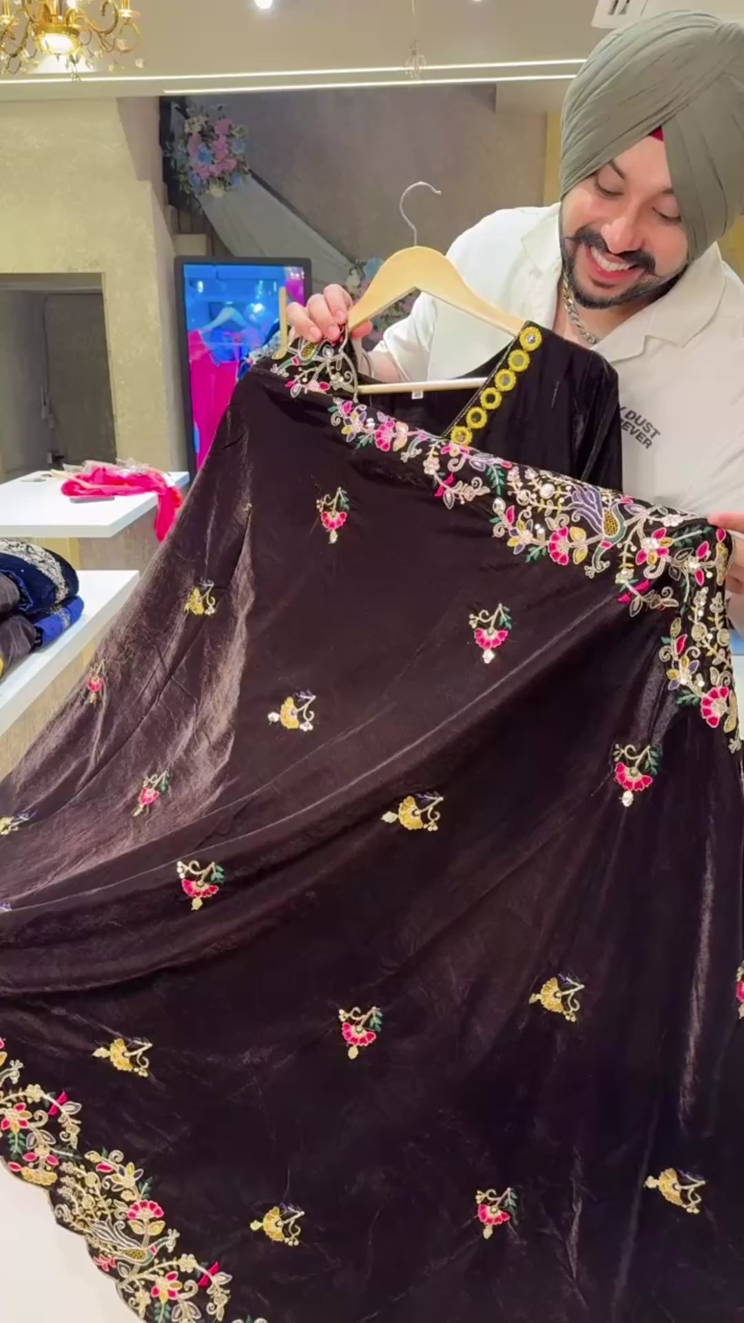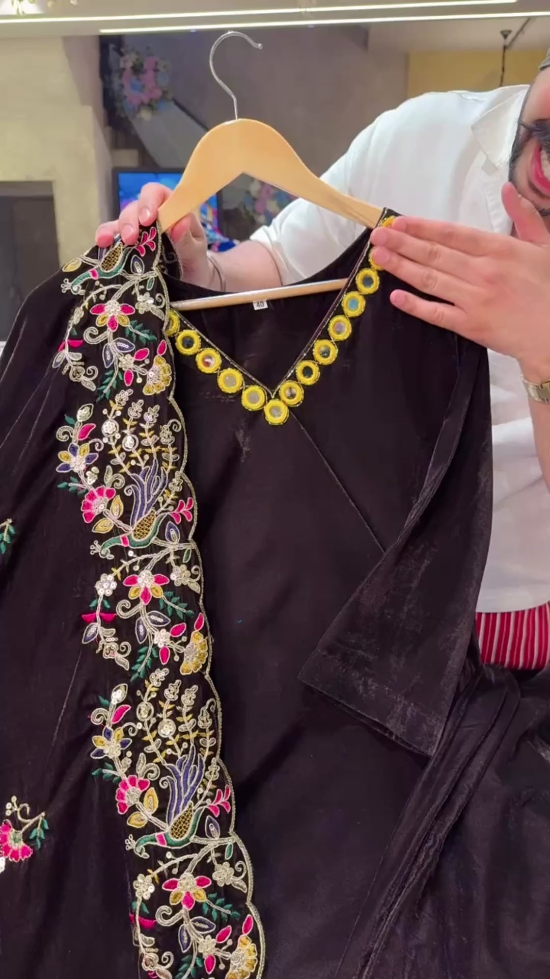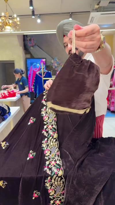 Dark Coffee Velvet Party Wear Suit with Hwavy embroidered Duppata & Cute Potli