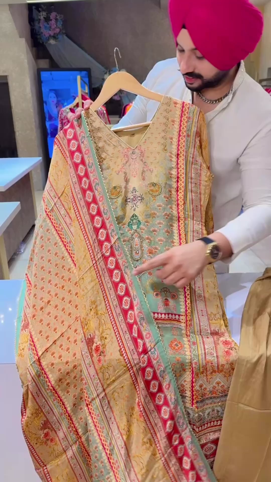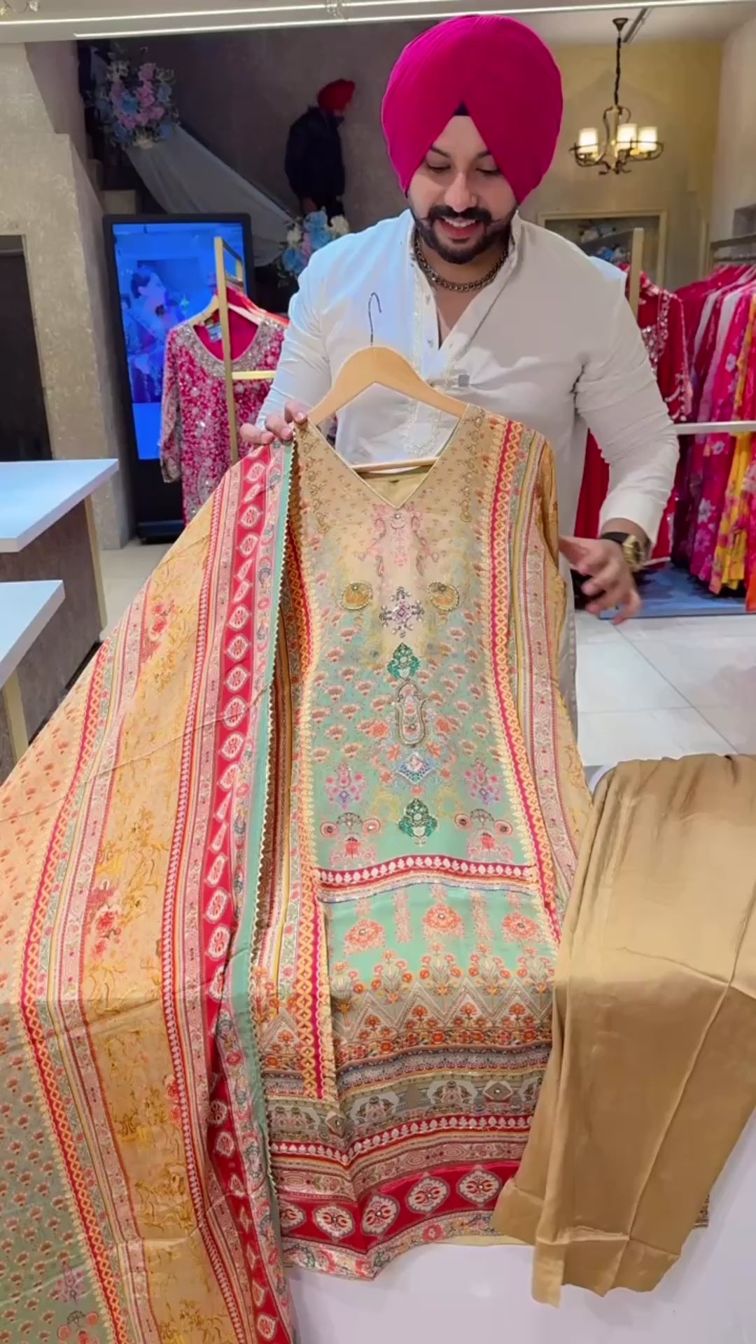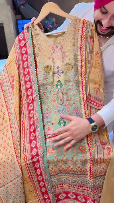 Dark English Beige Crepe digital Print party Wear Suit with Hand embroidery Work on neck