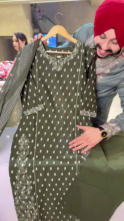 Dark Green Pure Cotton Embroidered Office Wear Suit With Beautiful Duppata