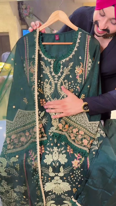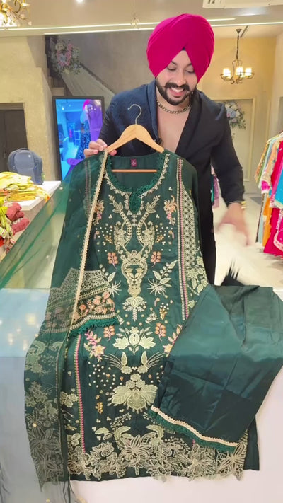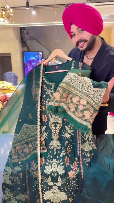 Dark green Raw Shimmer Silk Fully Embroidered Kashmiri Suit with Beautiful Organza Duppata