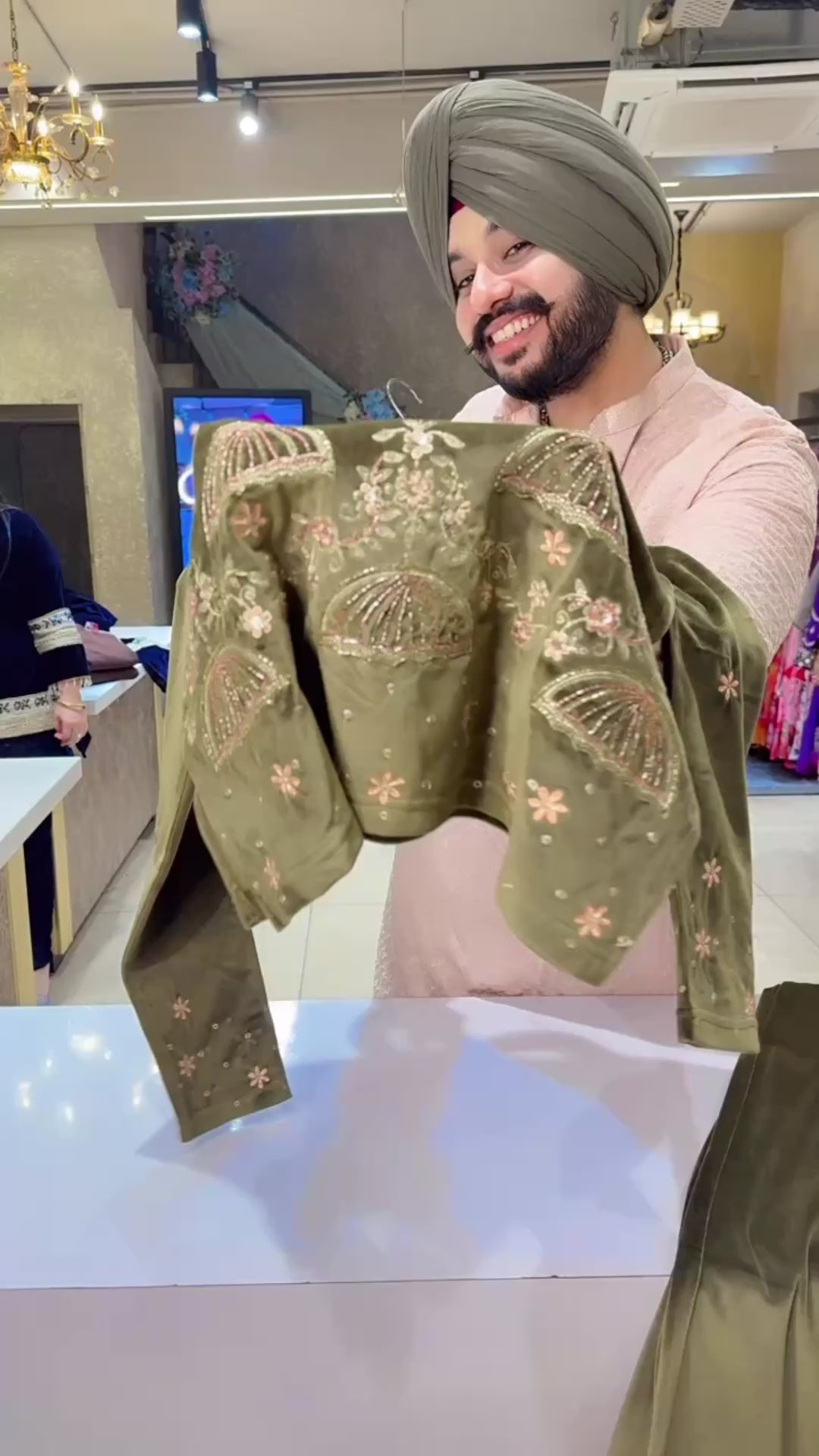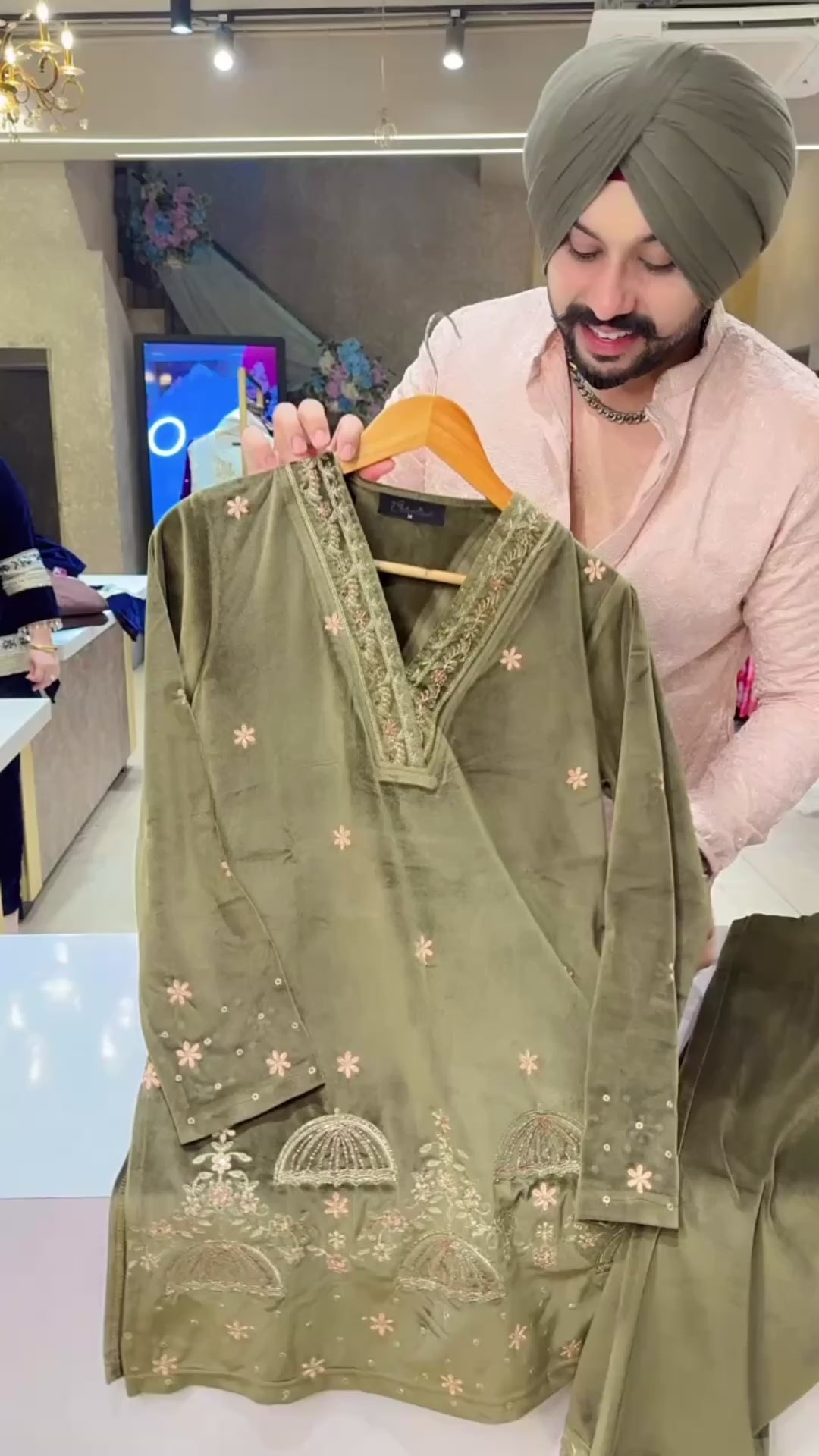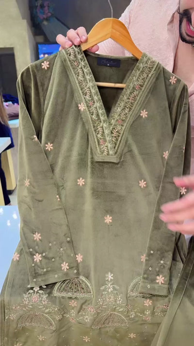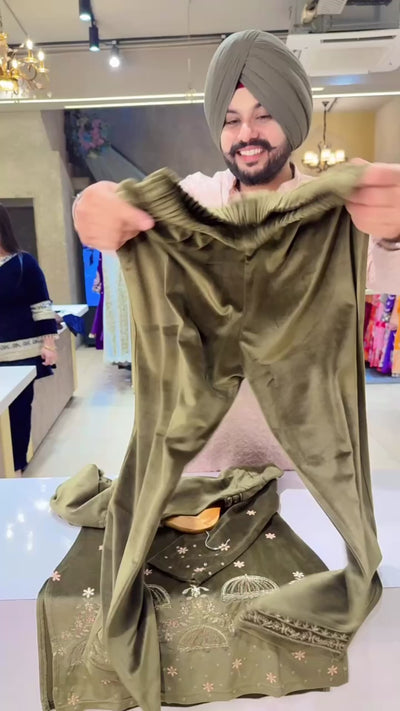 Dark Olive Strechable Velvet Jeavy Embroidered Party Wear Coord set
