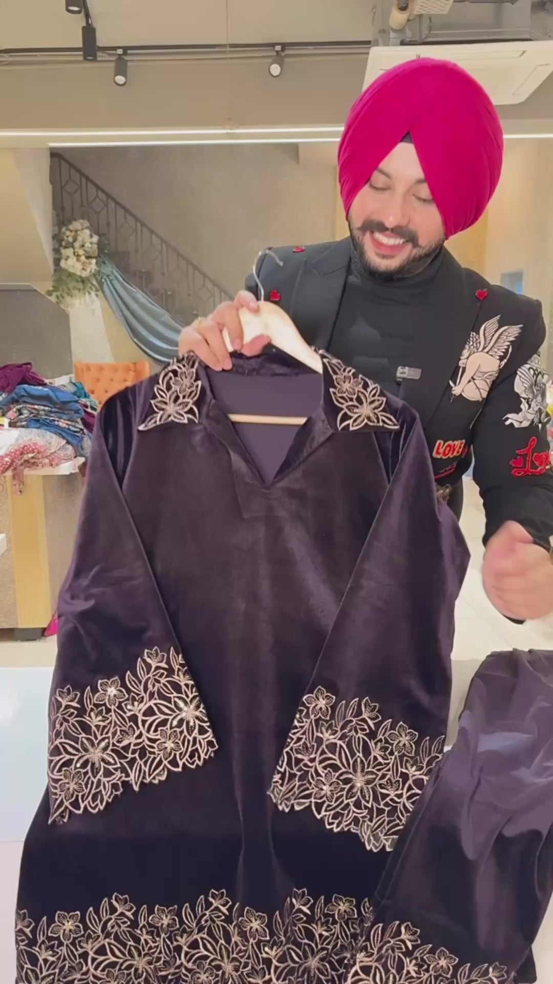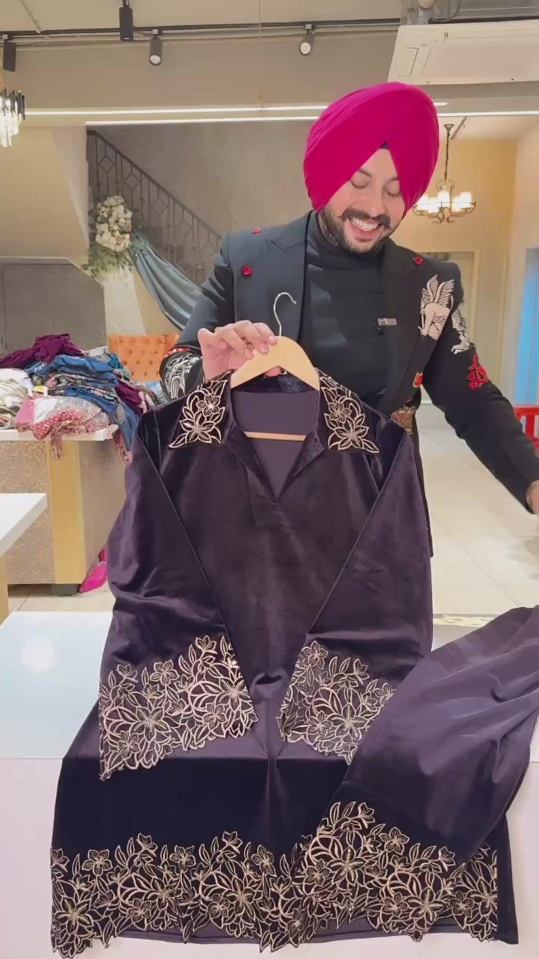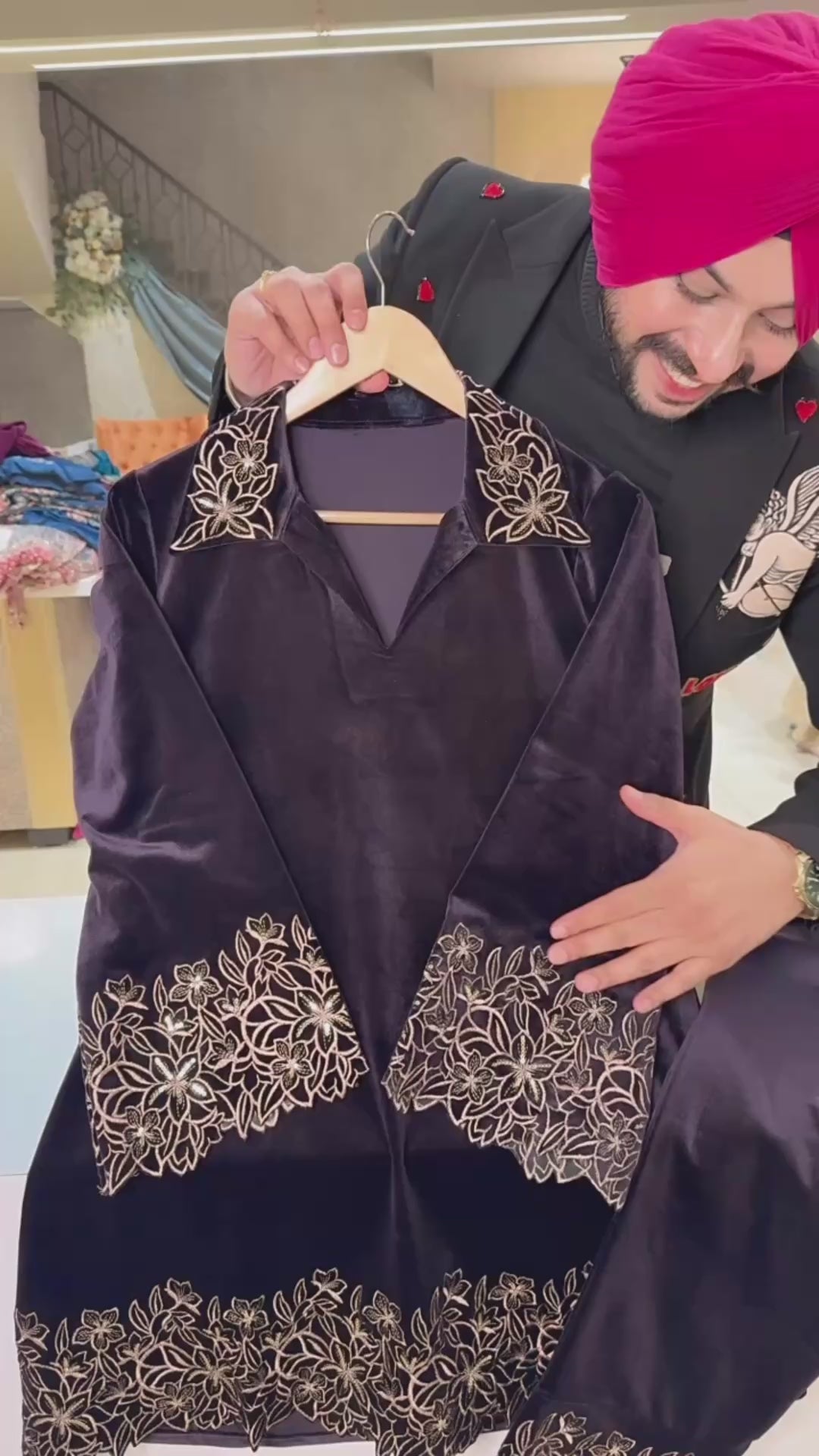 Dark Purple Strechable Velvet Collar neck Pakistani Coord set with Heavy Embroidery Work on it