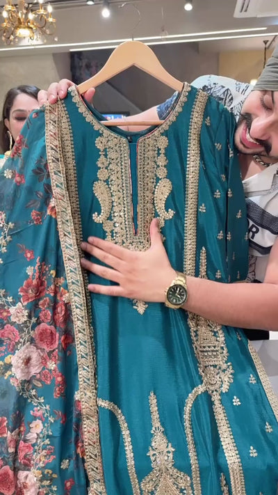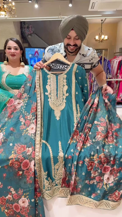 Dark Ramagreen Chinon Heavy Front & Back Embroidered Full Flair Floral Plazo suit with Beautiful Duppata