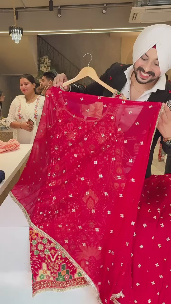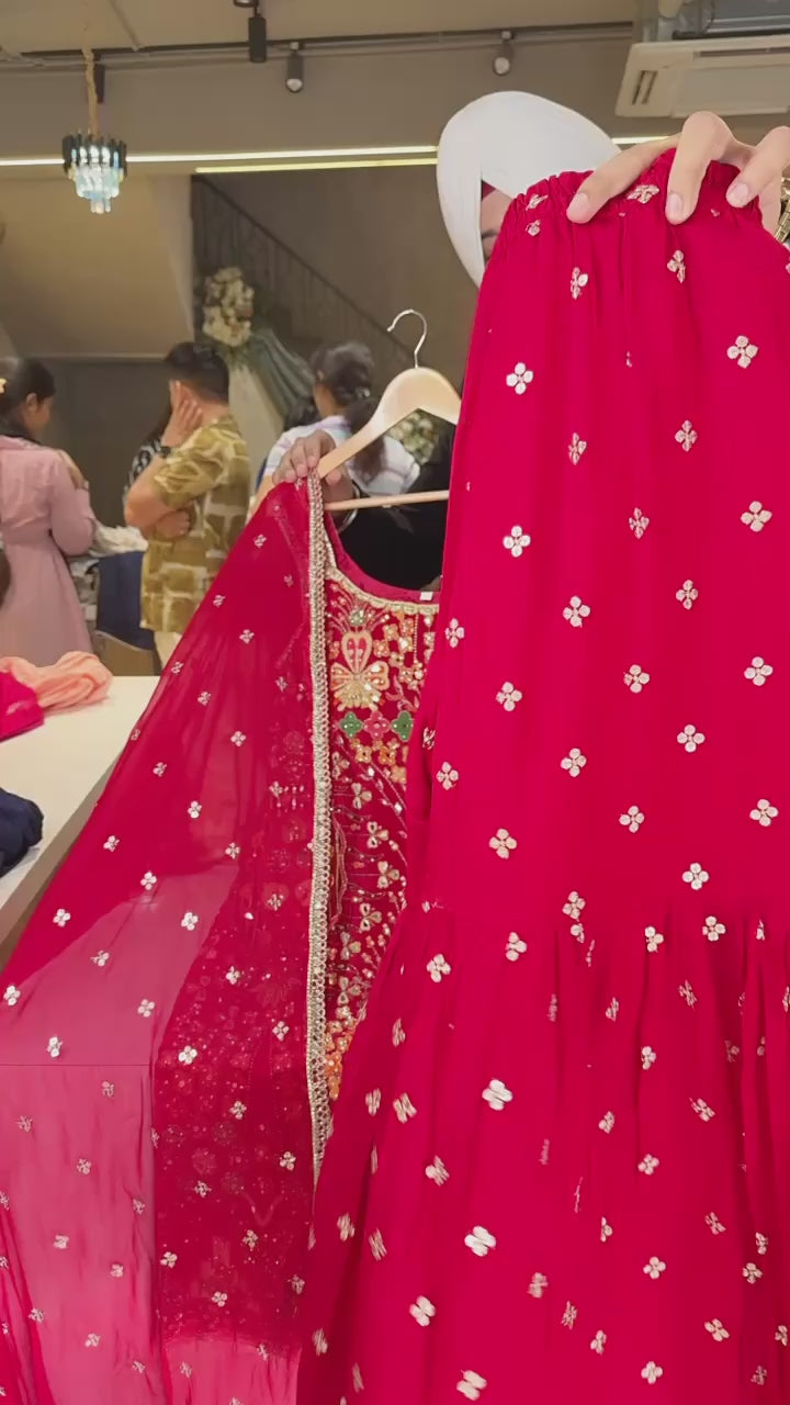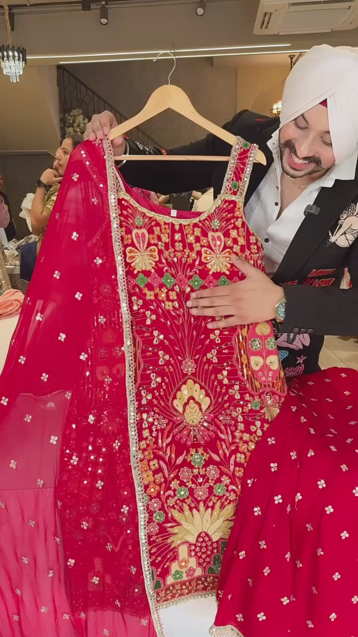 Deep Red Crepe Strap Sleeves Heavy embroidered Garara Suit