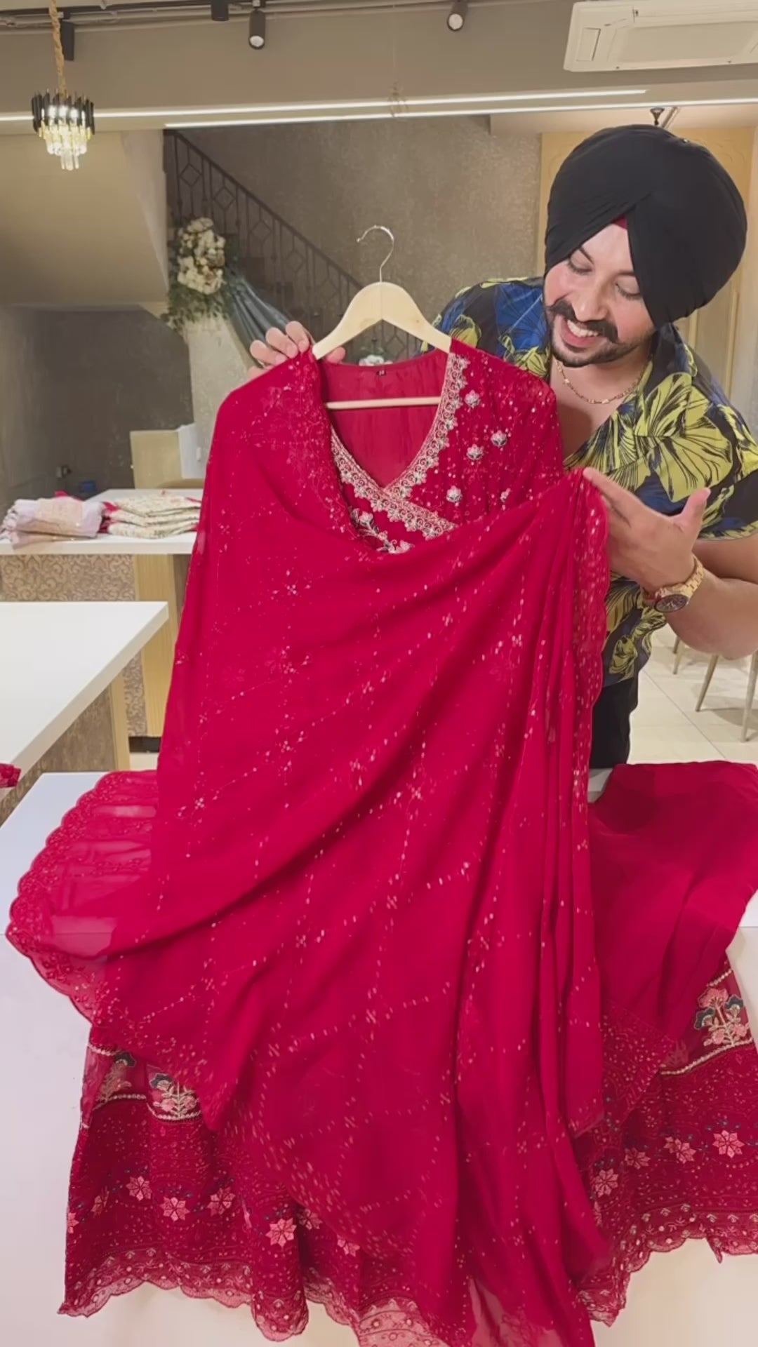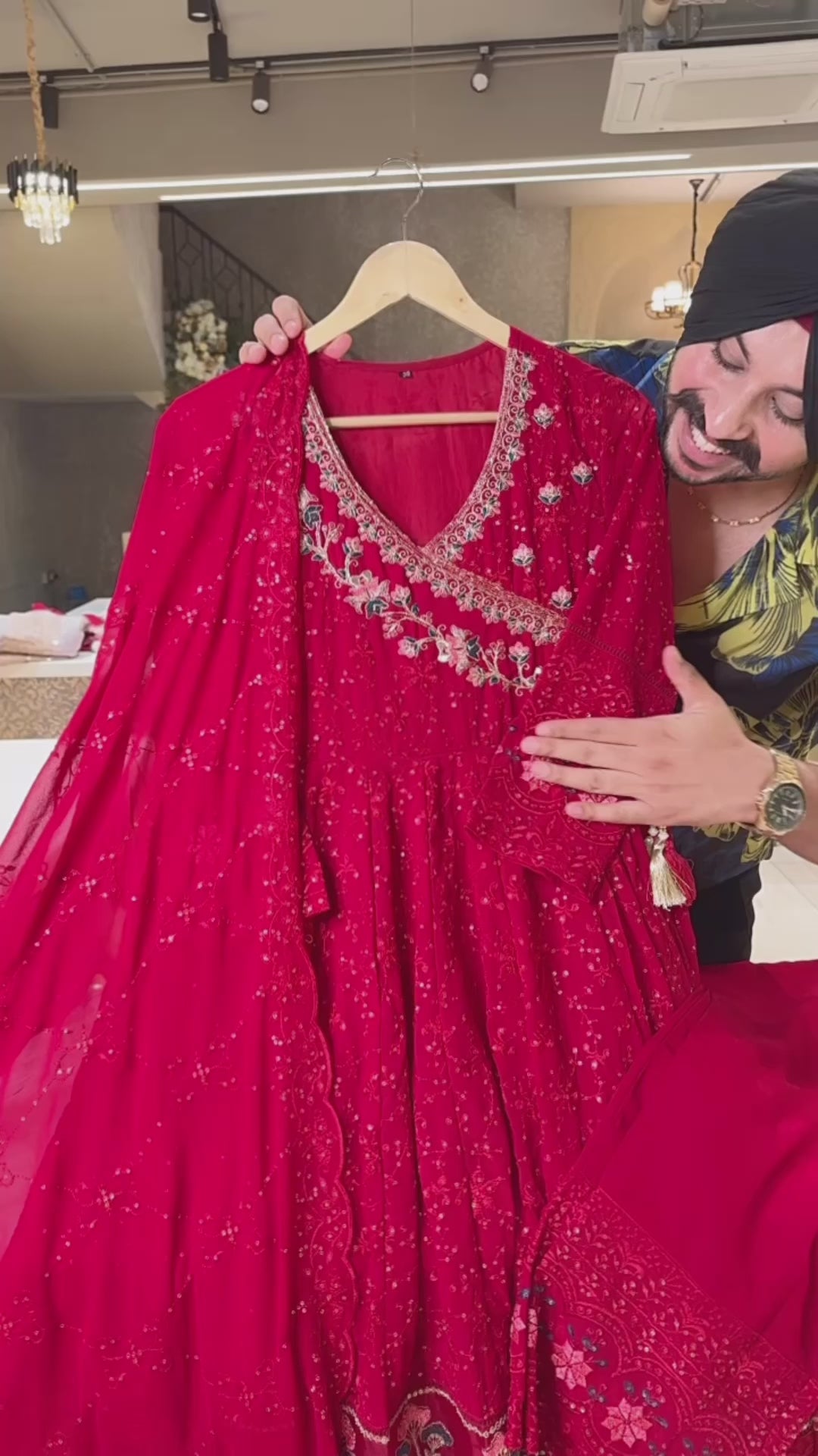 Deep Red Georgette Fully embroidered Angrakha Anarkali suit with Heavy border, pants $ Duppata