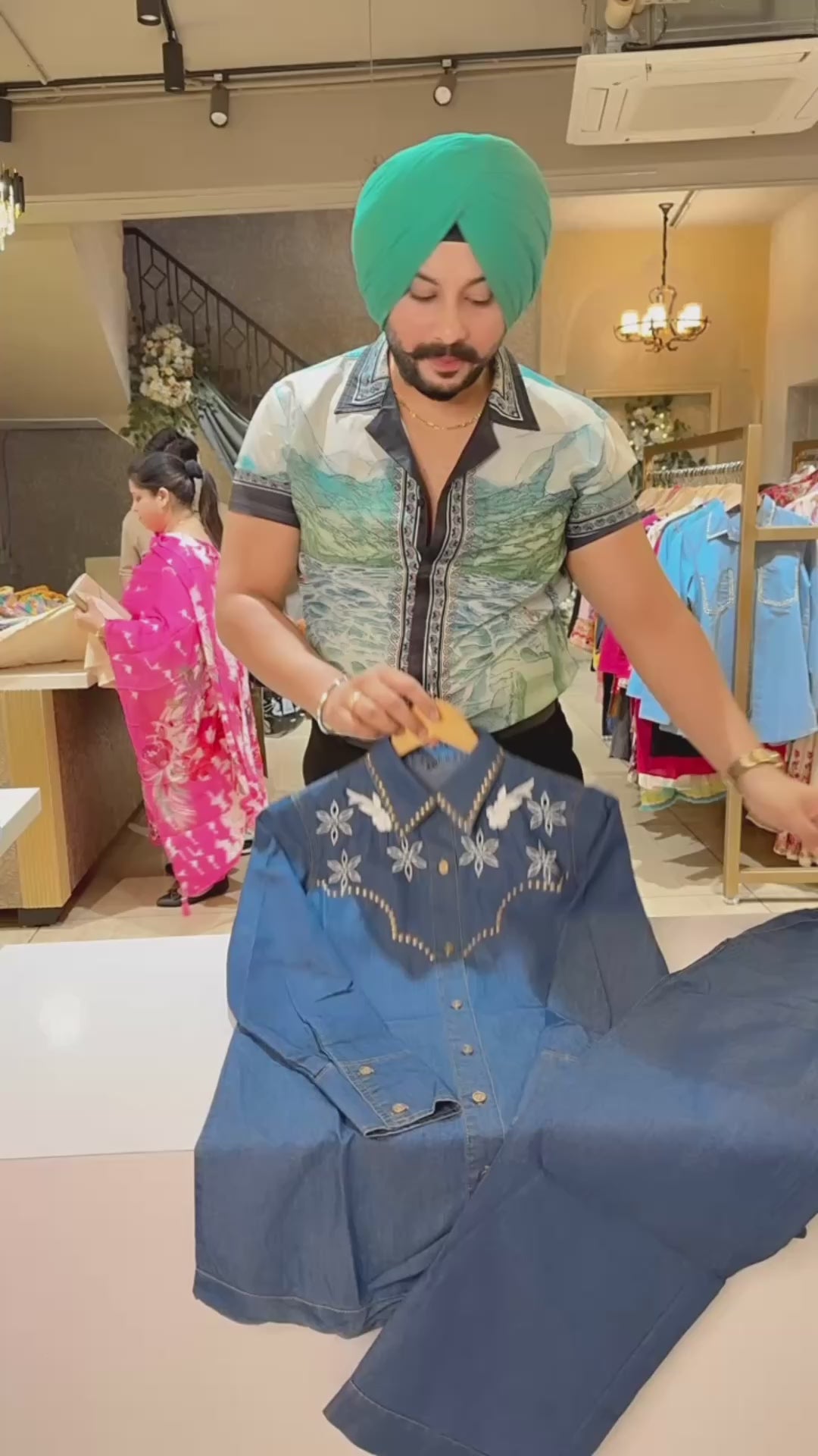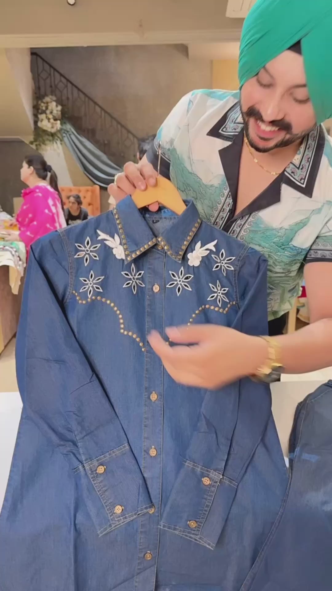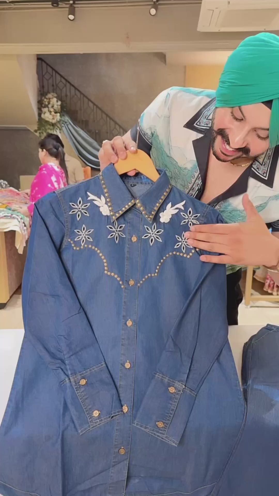 Dark Blue soft Denim Collar neck Coord set with Beautiful Sequins & Embroidery work on it