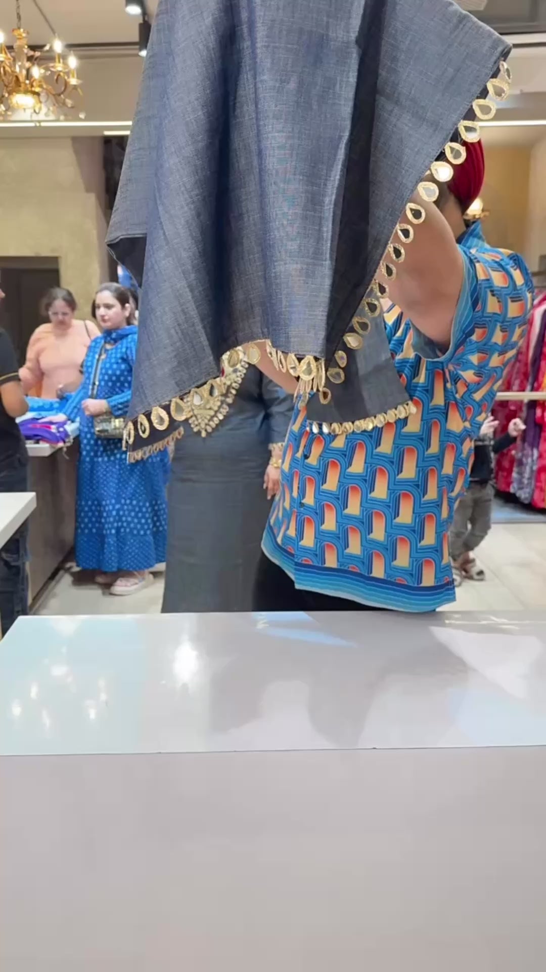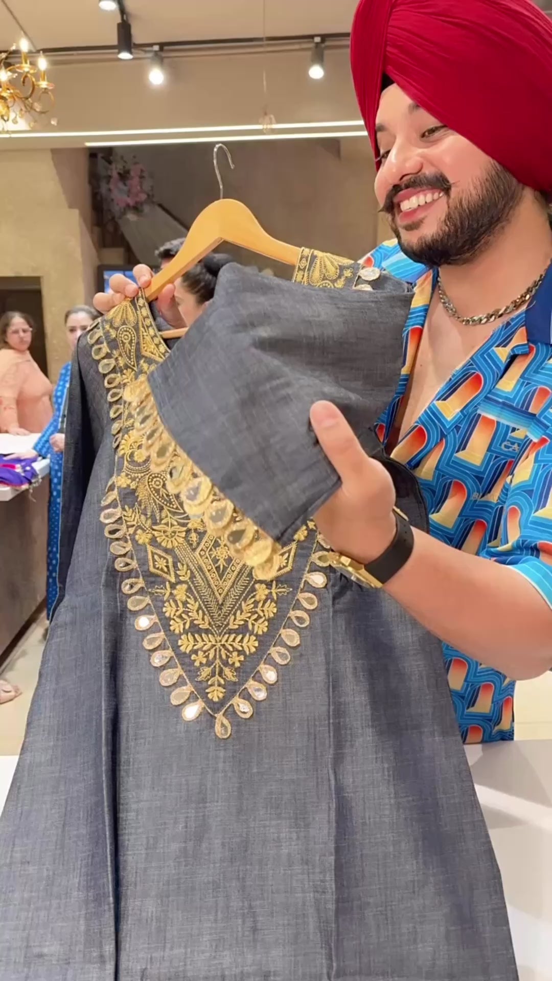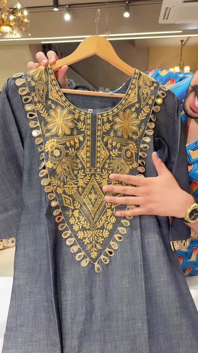 Blueish Grey Soft Denim Long Length Kashmiri Side Slit Dress with Beautiful Embroidery & Mirror work on it