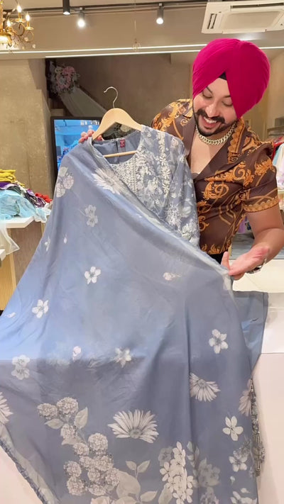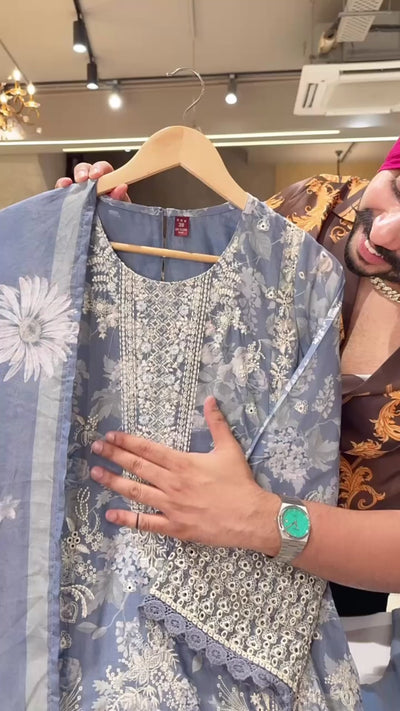 English Blue Heavy embroidered Kashmiri Suit with Mal Mal Duppata