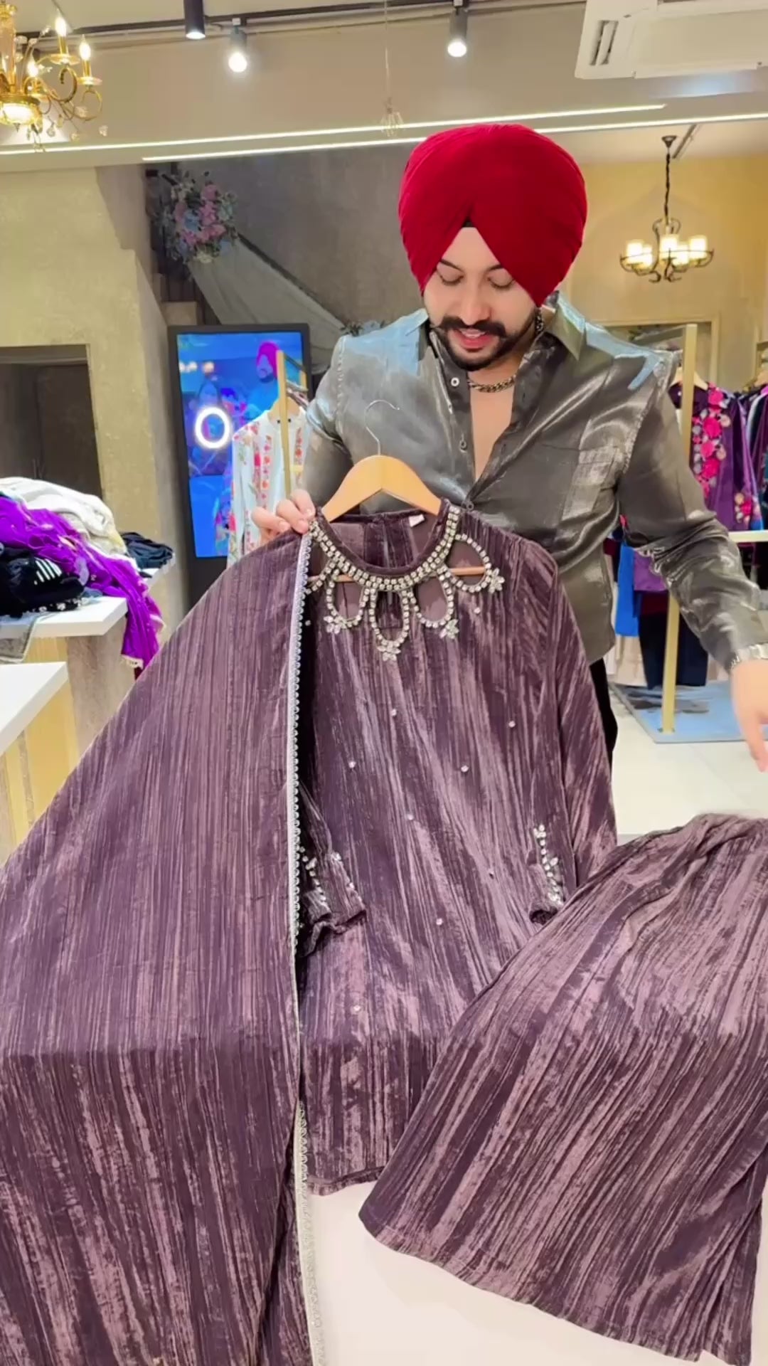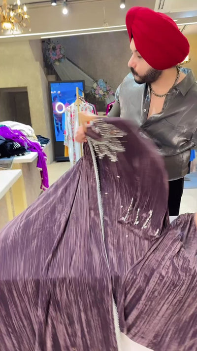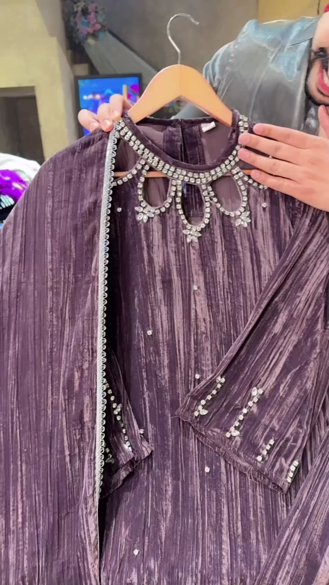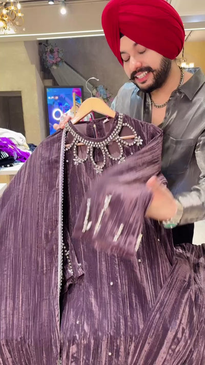 English Mauve Crush Velvet Designer Neck Heavy Stone Work Indo western Suits