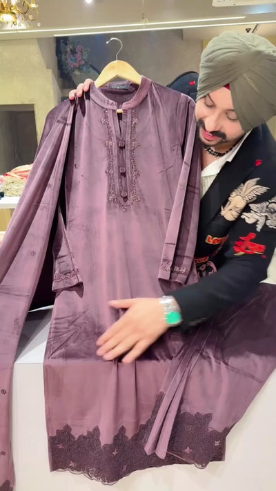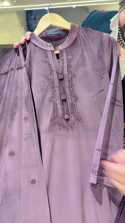 English Mauve Velvet Heavy Self Embroidered Party Wear straight Suit with Beautiful Duppata
