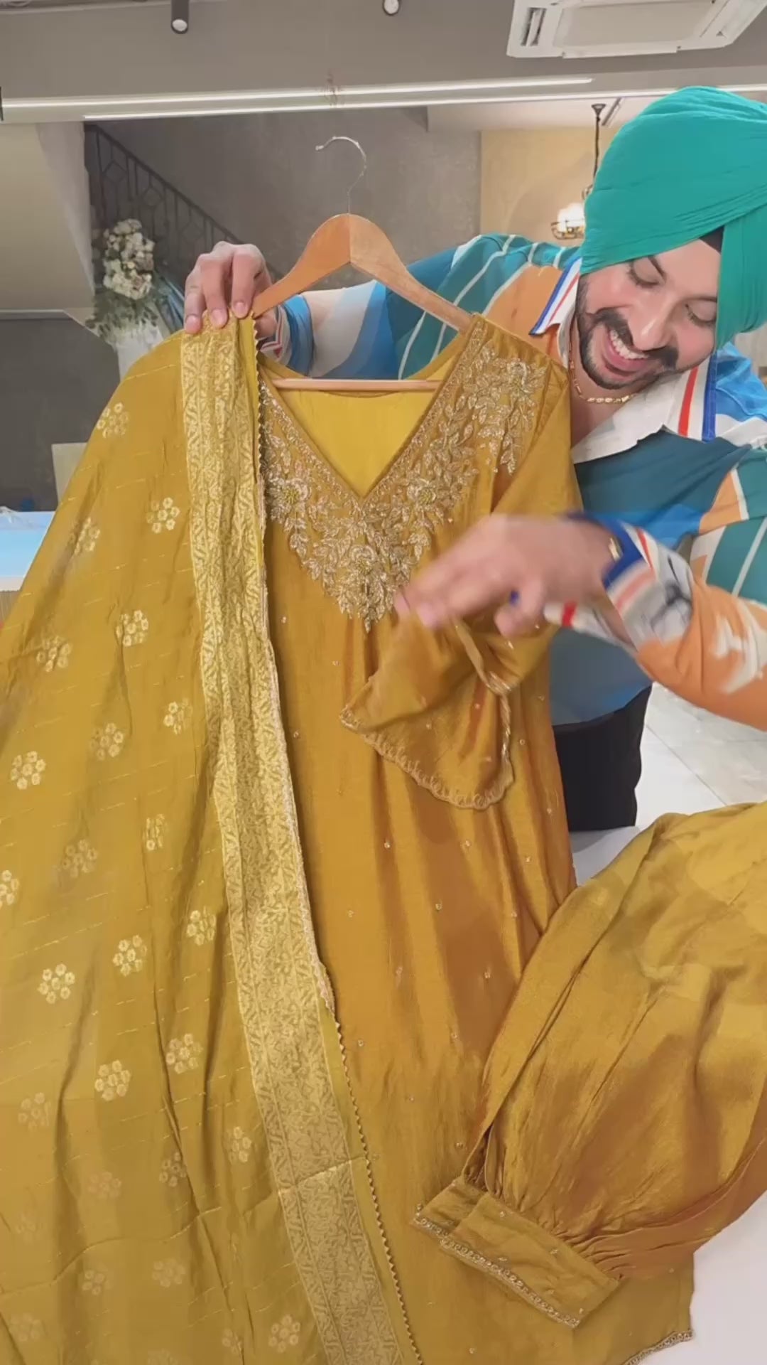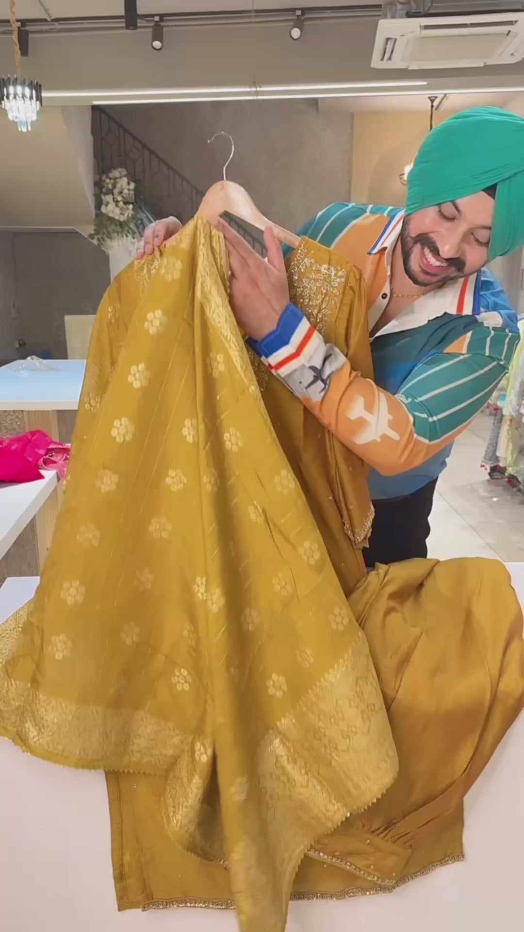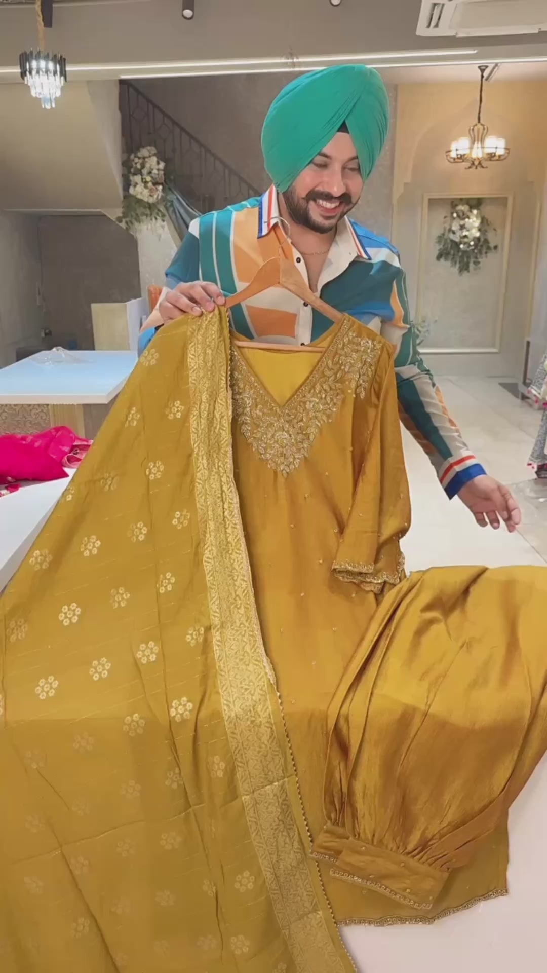 Goldenish Mustard Chinon Hand embroidered Pakistani suit with Pathani pants
