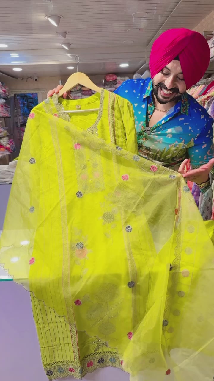 Fluorescent Green Soft Organza Embroidered Straight Suit with