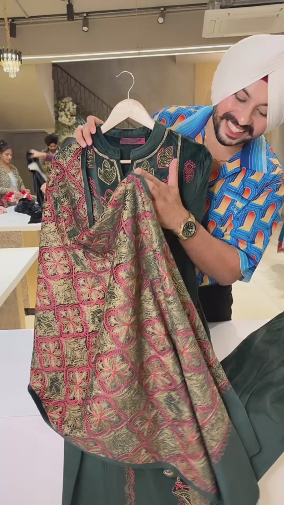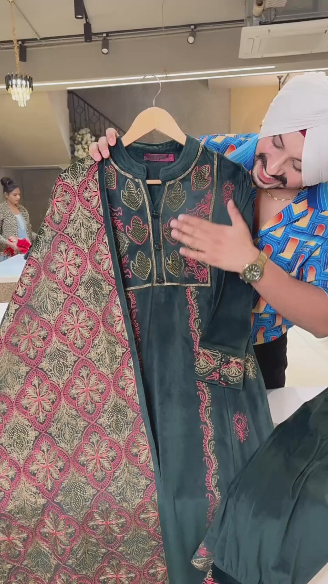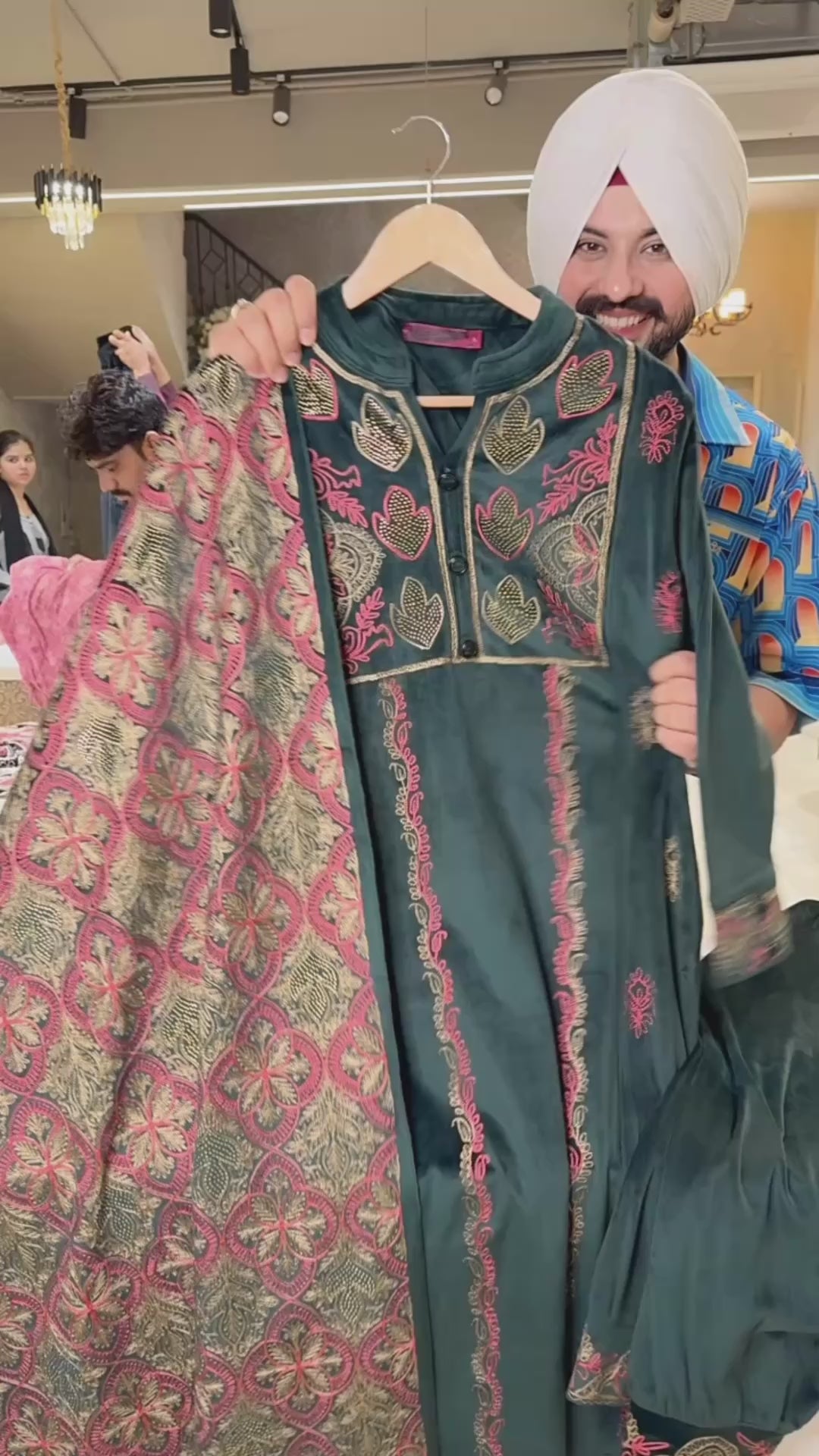 Green Strechable Velvet Embroidered Pathani Suit with Heavy Duppata