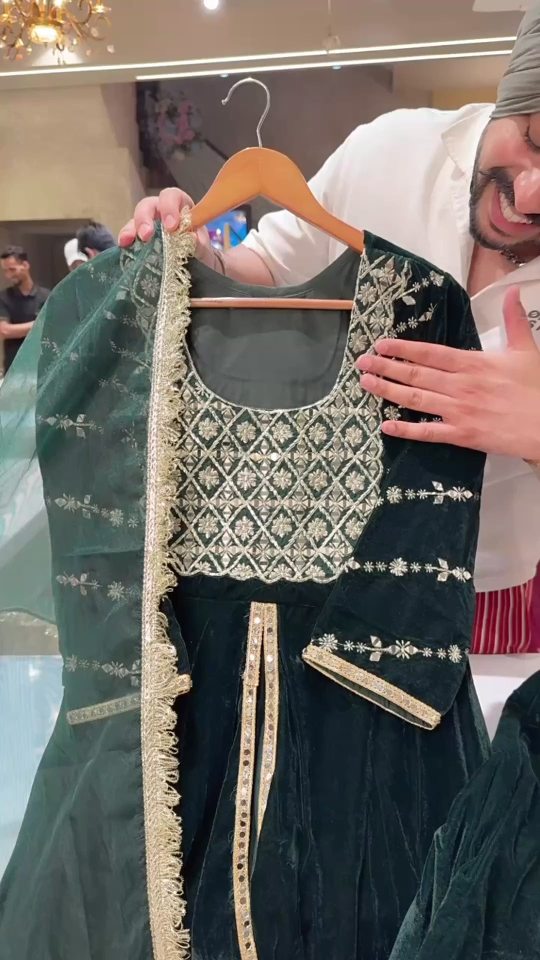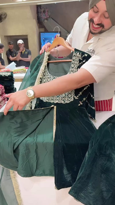 Bottle Green Velvet Heavy embroidered Front Slit Paplum Suit with Cute Potli & Organza Duppata