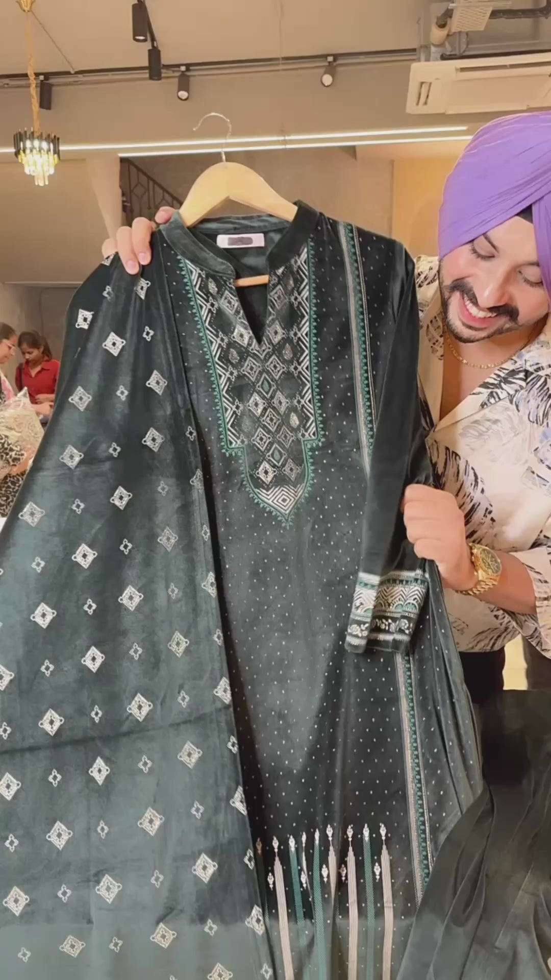 Dark Green Heavy Velvet Fully (Stretchable) Straight Suits with Beautiful Duppata