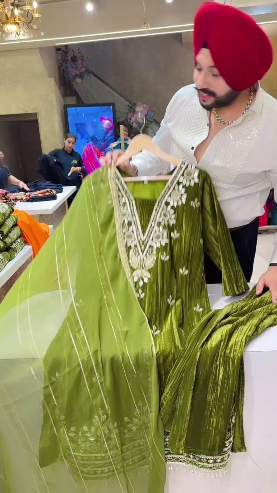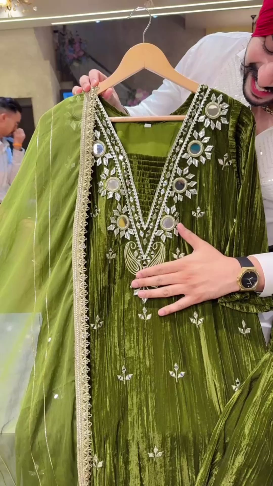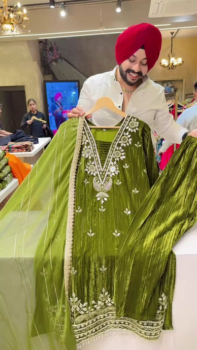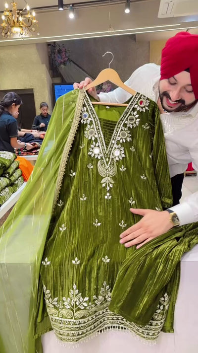 Mehendi Green Crush Velvet Mirror & Gotta Work Straight Suit with Beautiful Chiffon Duppata