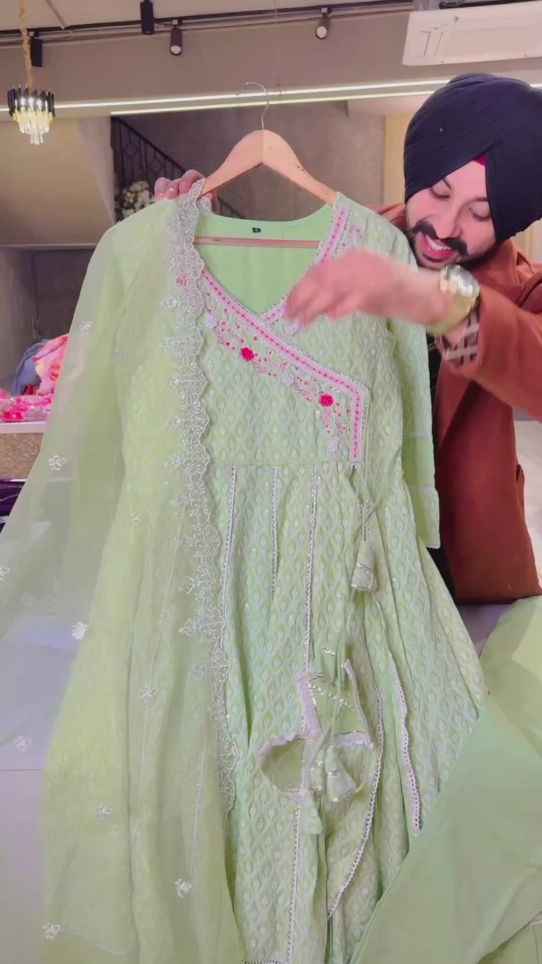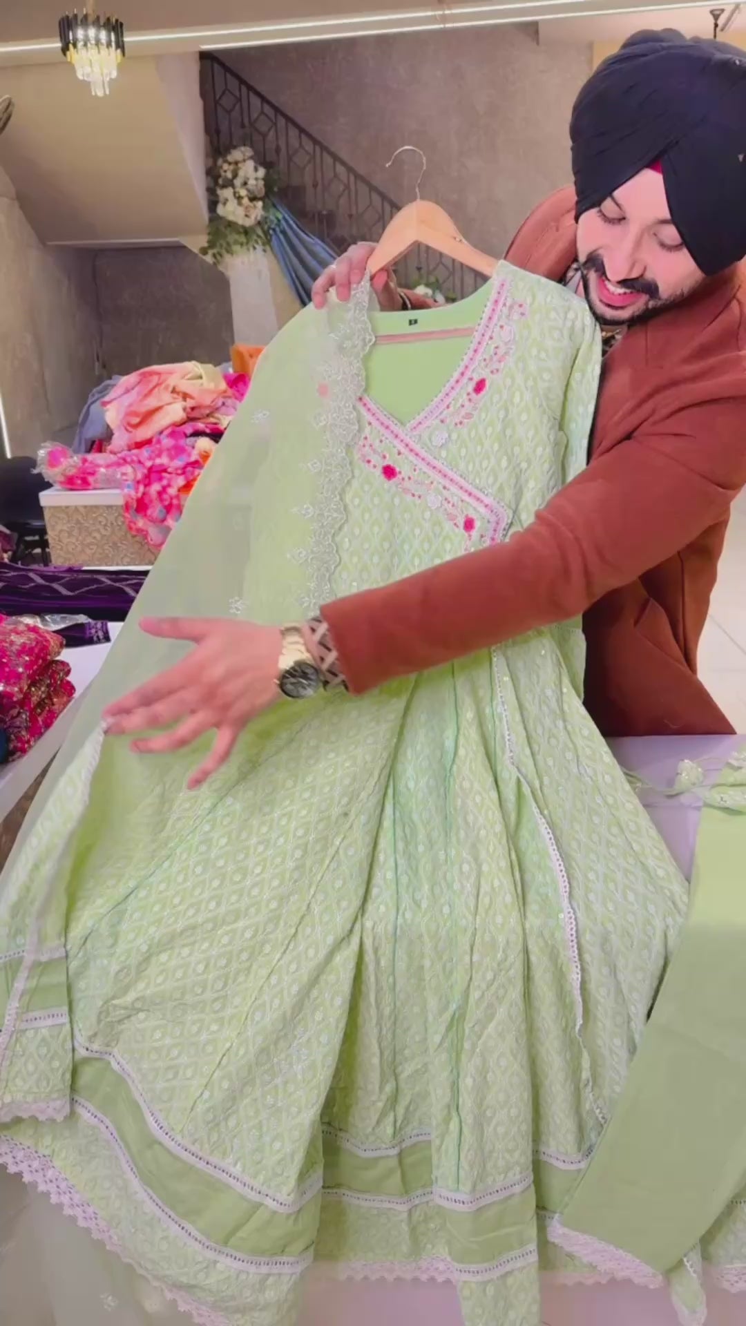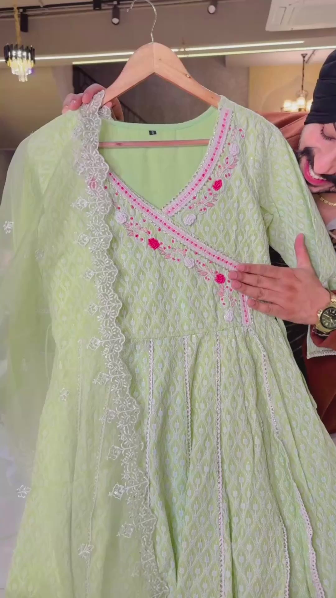 Pastel Green pure Cotton Fully embroidered & self Sequins Angrakha Side Slit Anarkali Suit