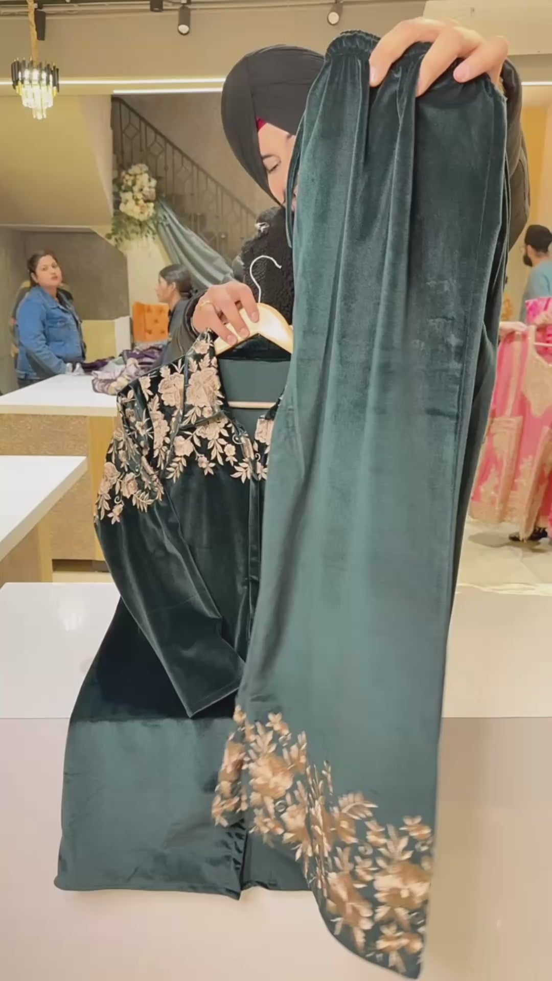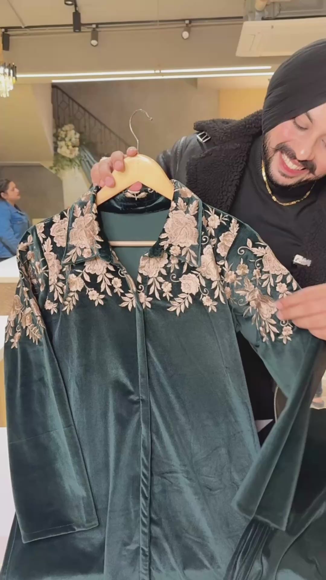 Dark green Heavy Strechable Velvet Coord set with Beautiful Embroidery work on collar & bell bottom Pants