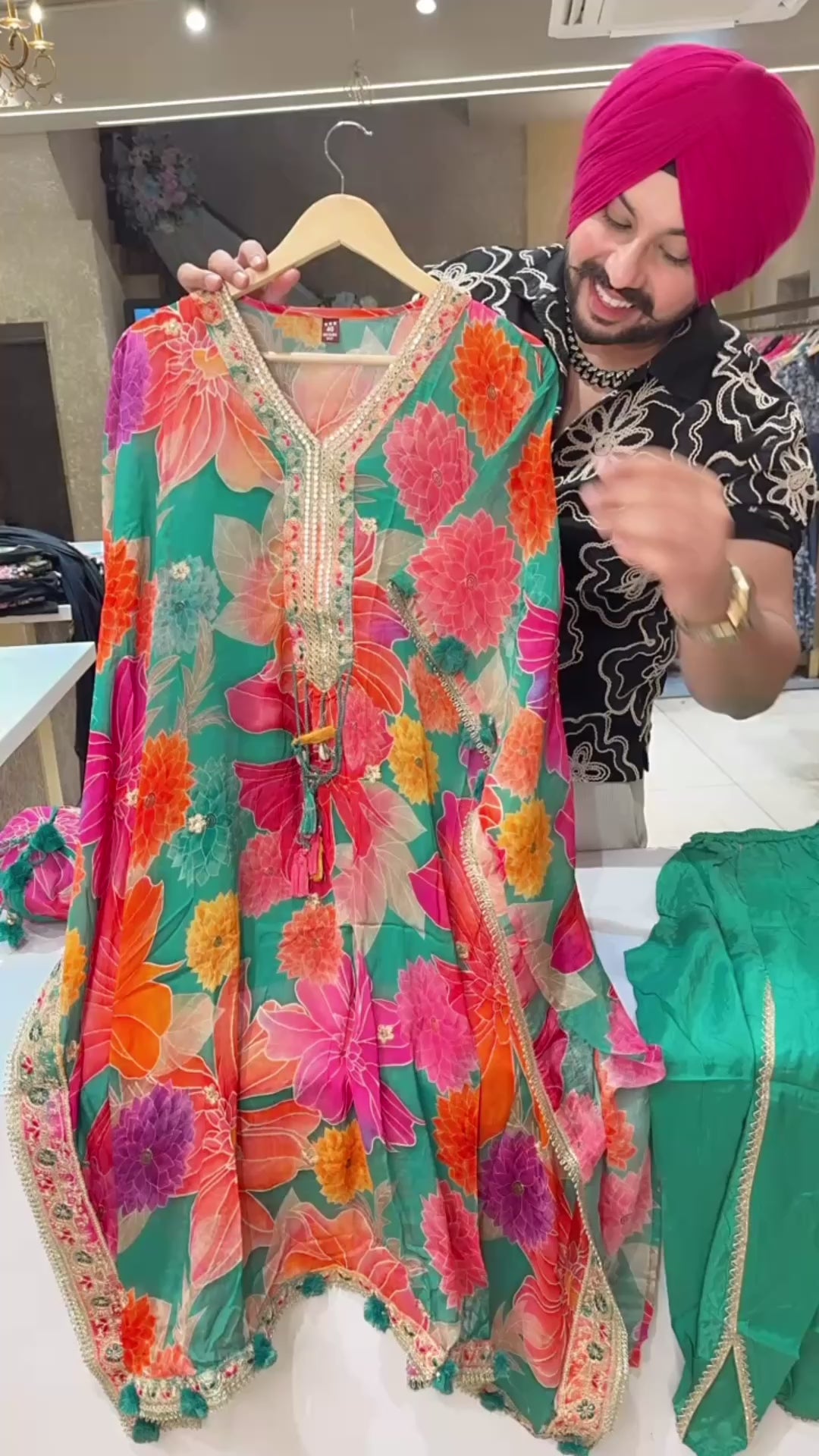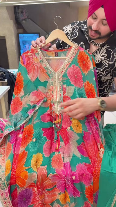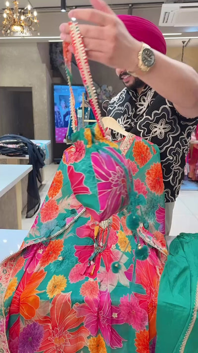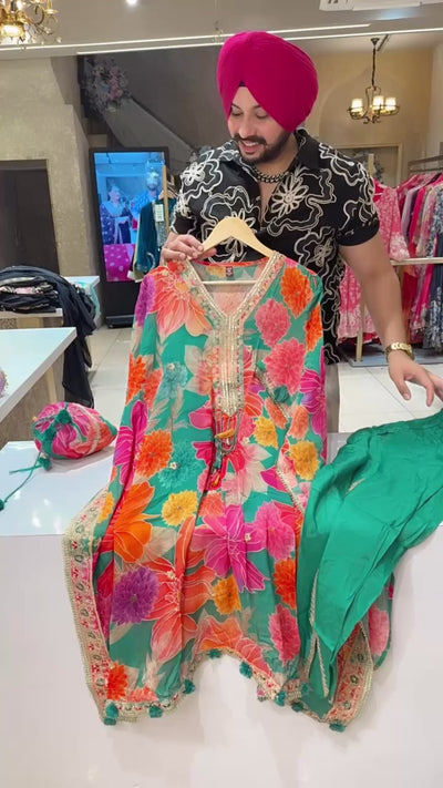 Green & MultiColored Chinon embroidered Kaftan Tulip Coord set with Cute Potli