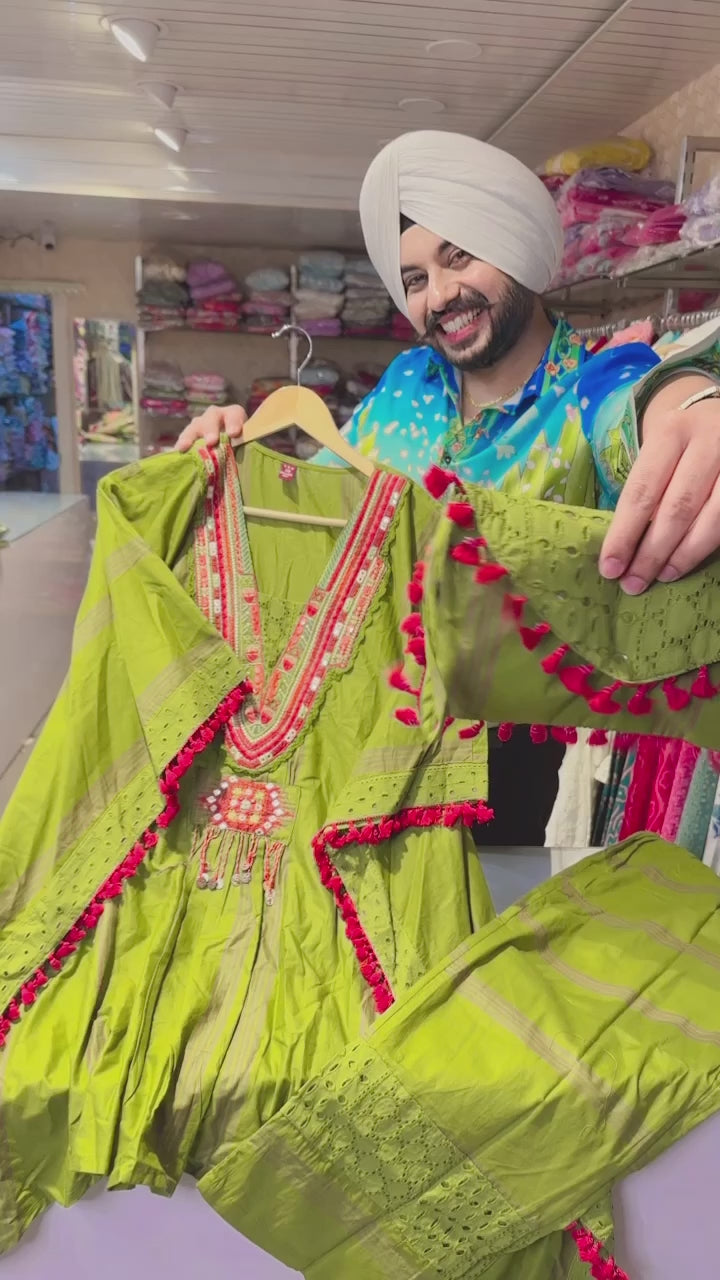 Green Pure Cotton Embroidered Kaftan Coord set with Purse
