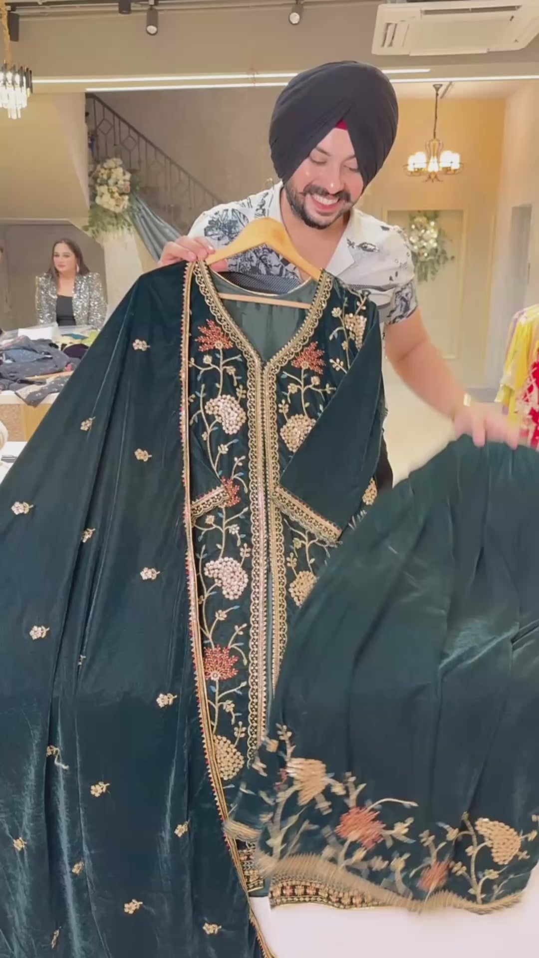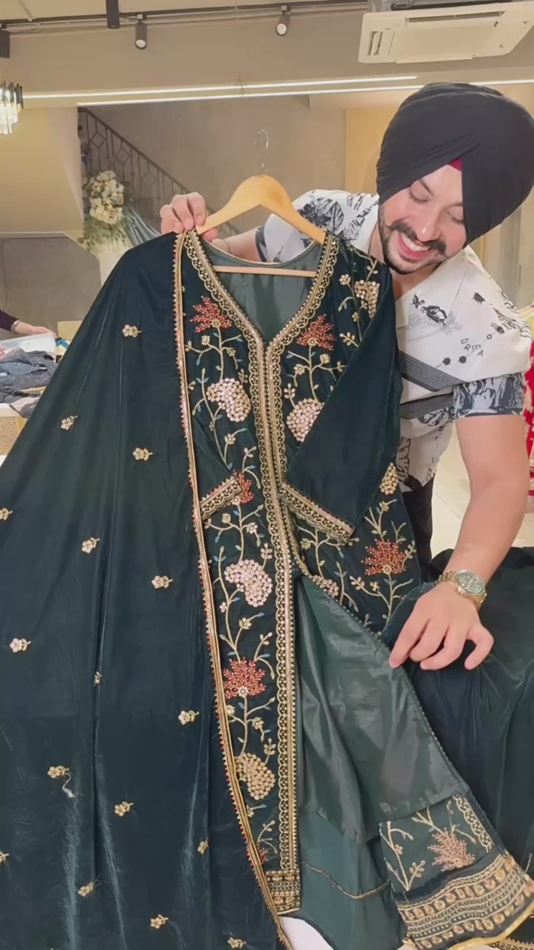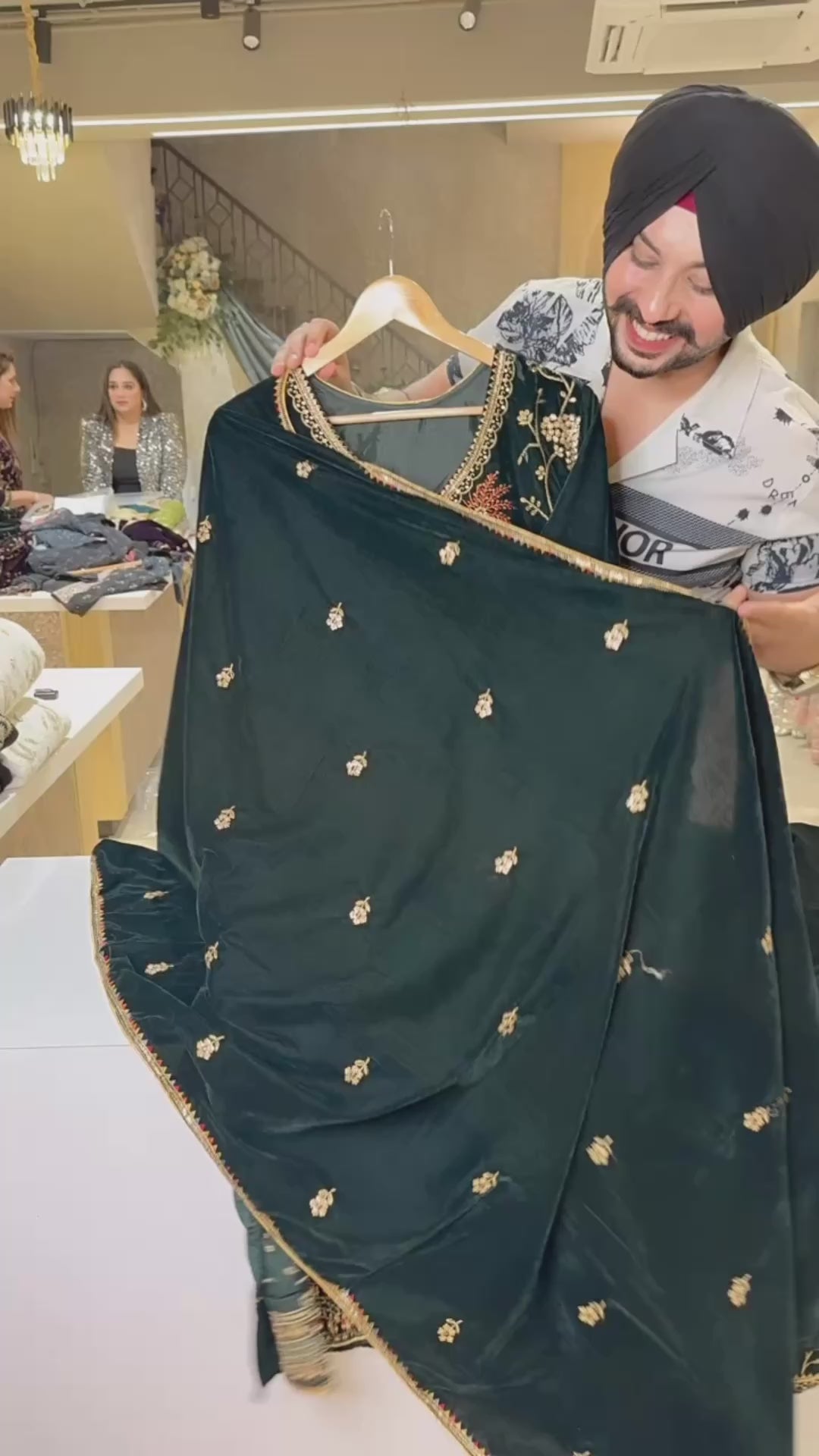 Green Velvet Heavy Embroidered Front & side Slit Azaaro set with Beautiful Duppata
