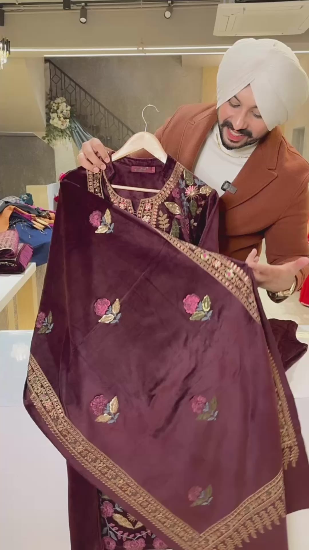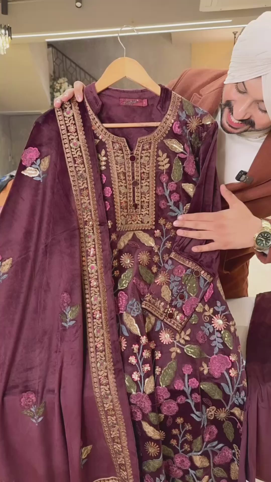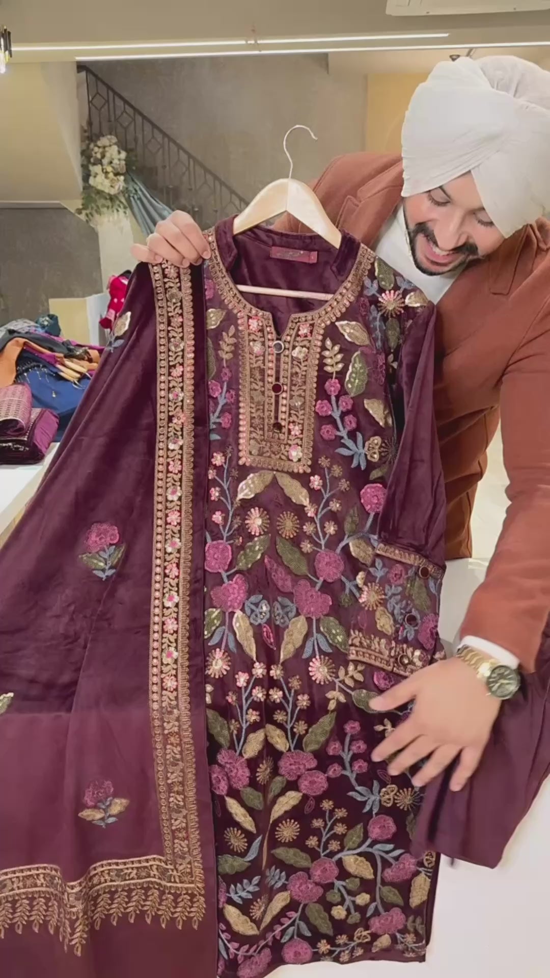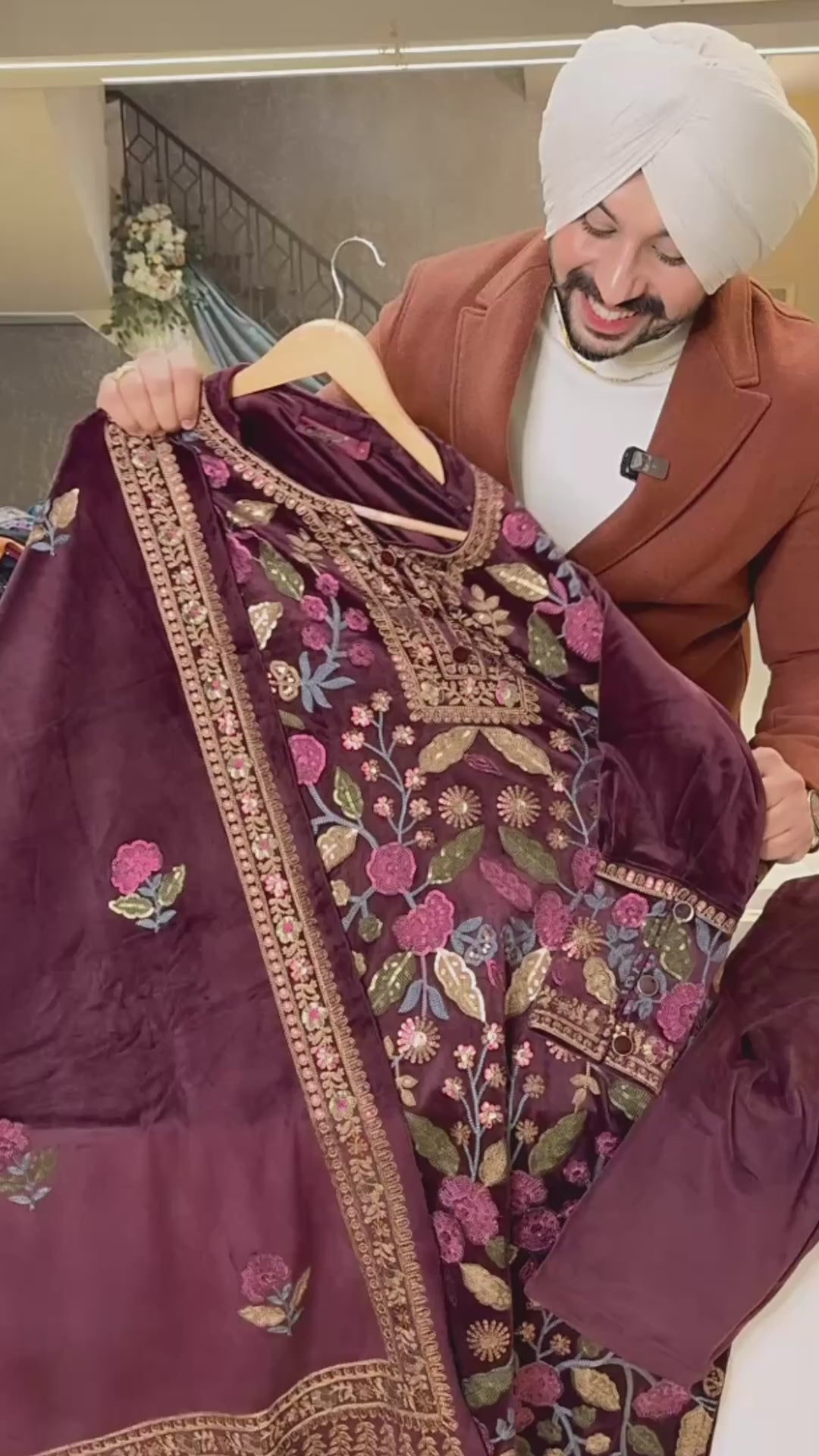 Winish maroon Heavy Strechable Velvet Fully embroidered Straight Suit with Beautiful Duppata