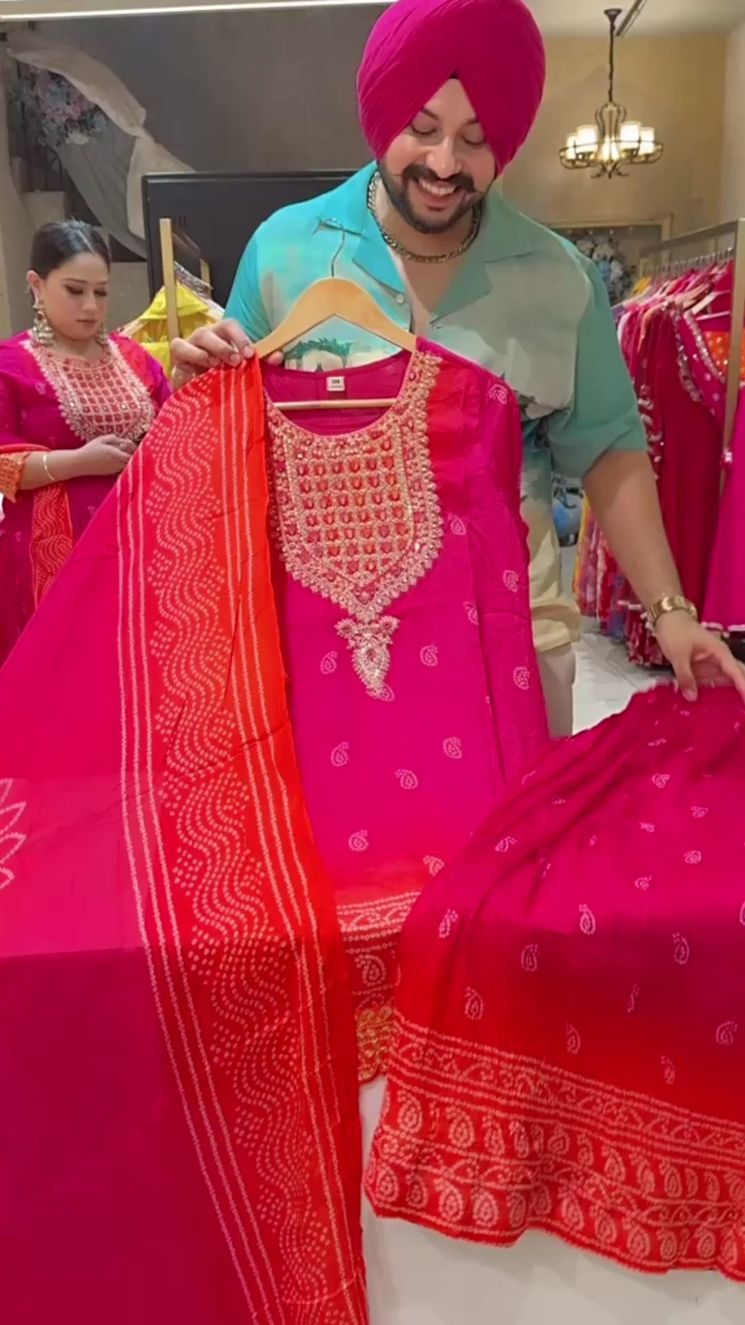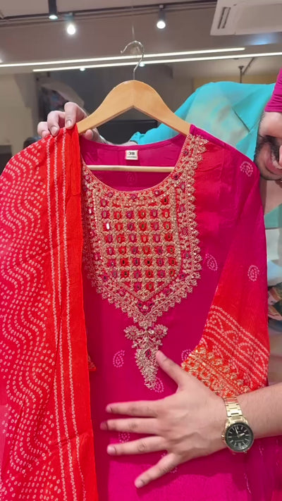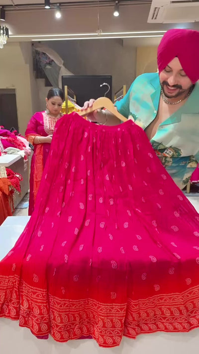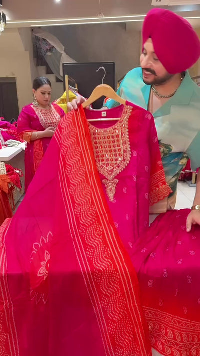 Hot Pink Bandhej print Chinon Heavy embroidered Full Flair Skirt Suit with Beautiful Duppata