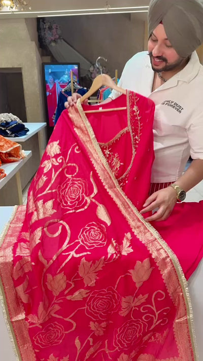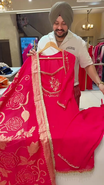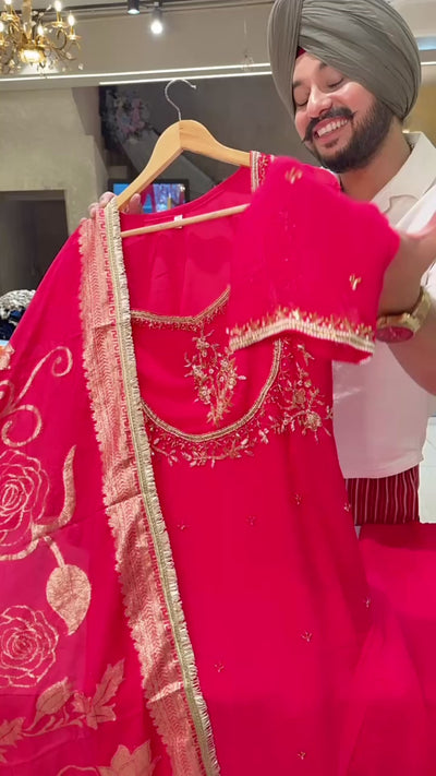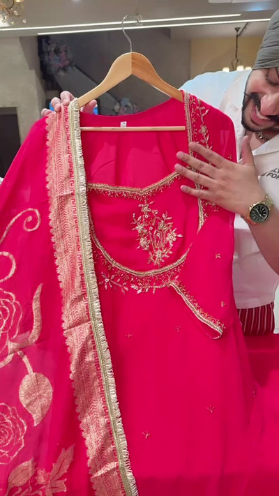 Hot Pink premium Georgette Heavy Hand embroidered Party wear Straight Suit with Banarasi Look Duppata