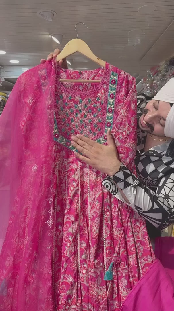 Hot pink Pure Cotton Full flair Anarkali suit with Beautiful embroidery work on neck
