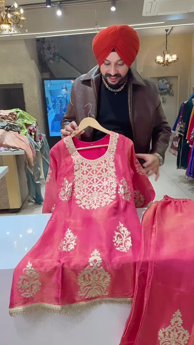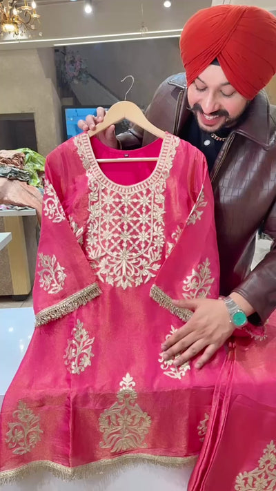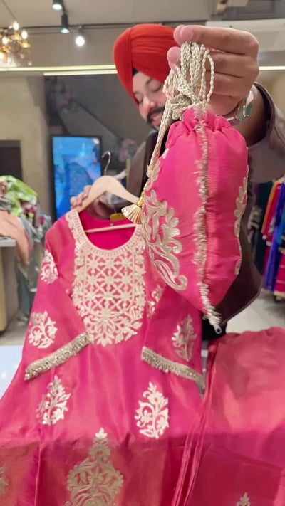 Hot Pink Shimmer Silk Gotta Embroidered kashmiri Coord set with Cute Potli