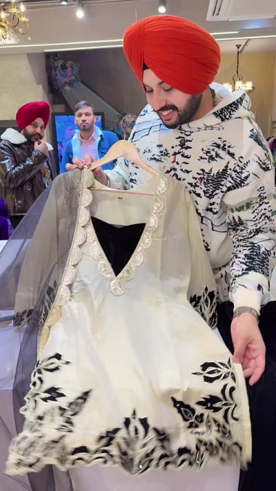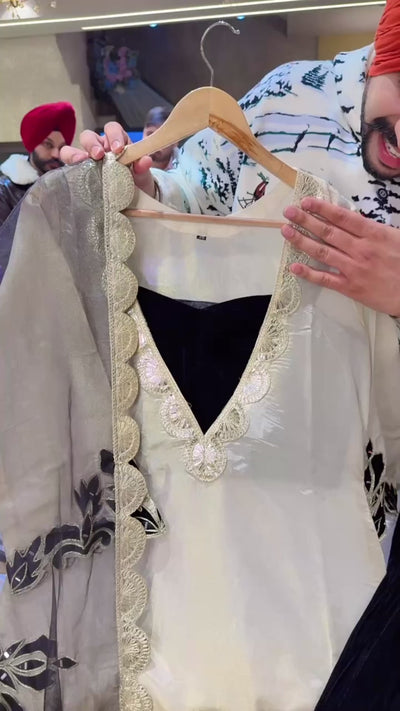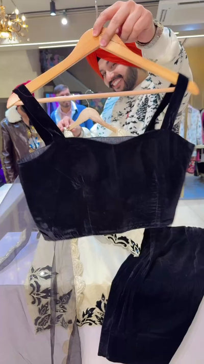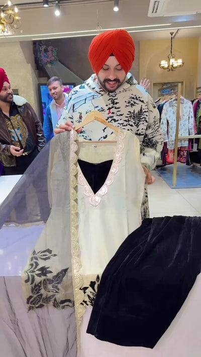 Ivory & Black Shimmer silk & velvet Designer Farshi Salwar set with Stylish bustier