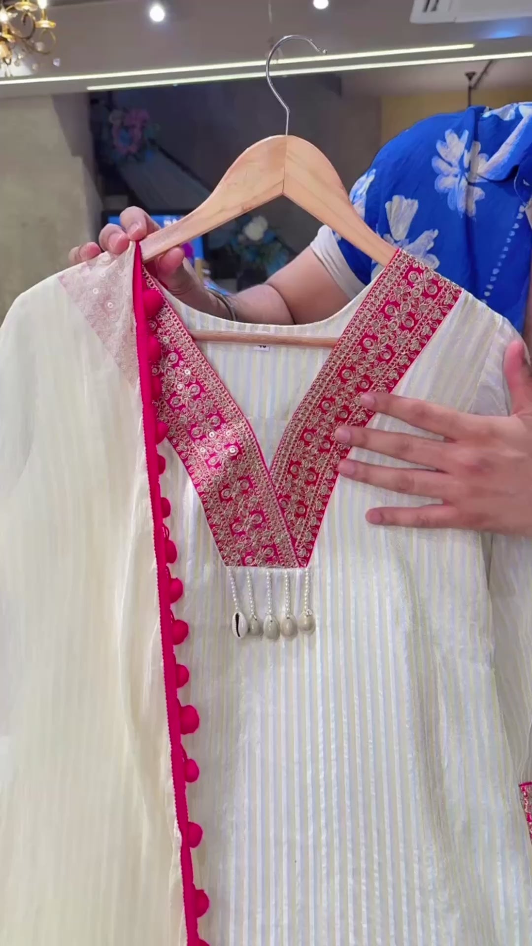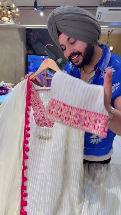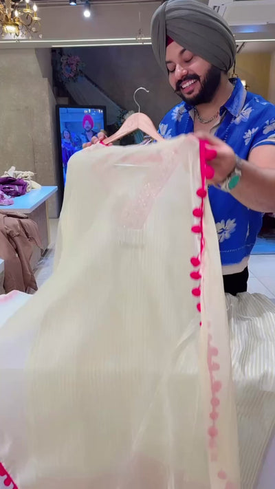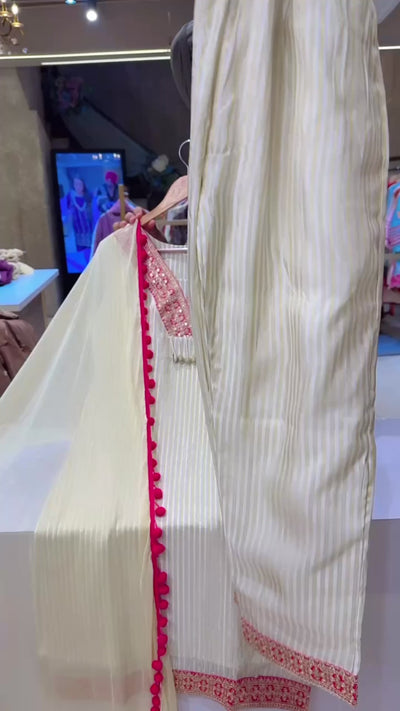 Ivory Colour Shimmer Silk Embroidered Party wear Suit with stylish Pom Pom Duppata