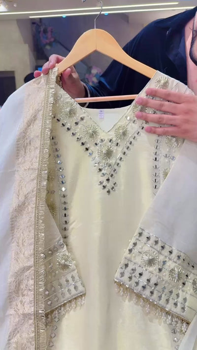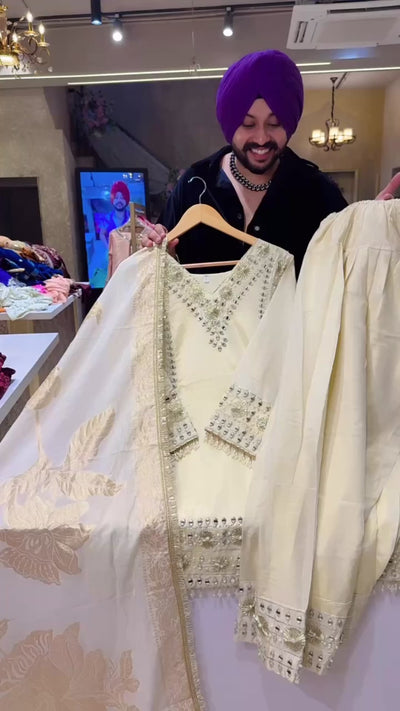Ivory Colour Shimmer Silk Heavy Gotta Embroidered & Pearl Work Farshi Salwar Suit with Beautiful Banarasi Look Duppata