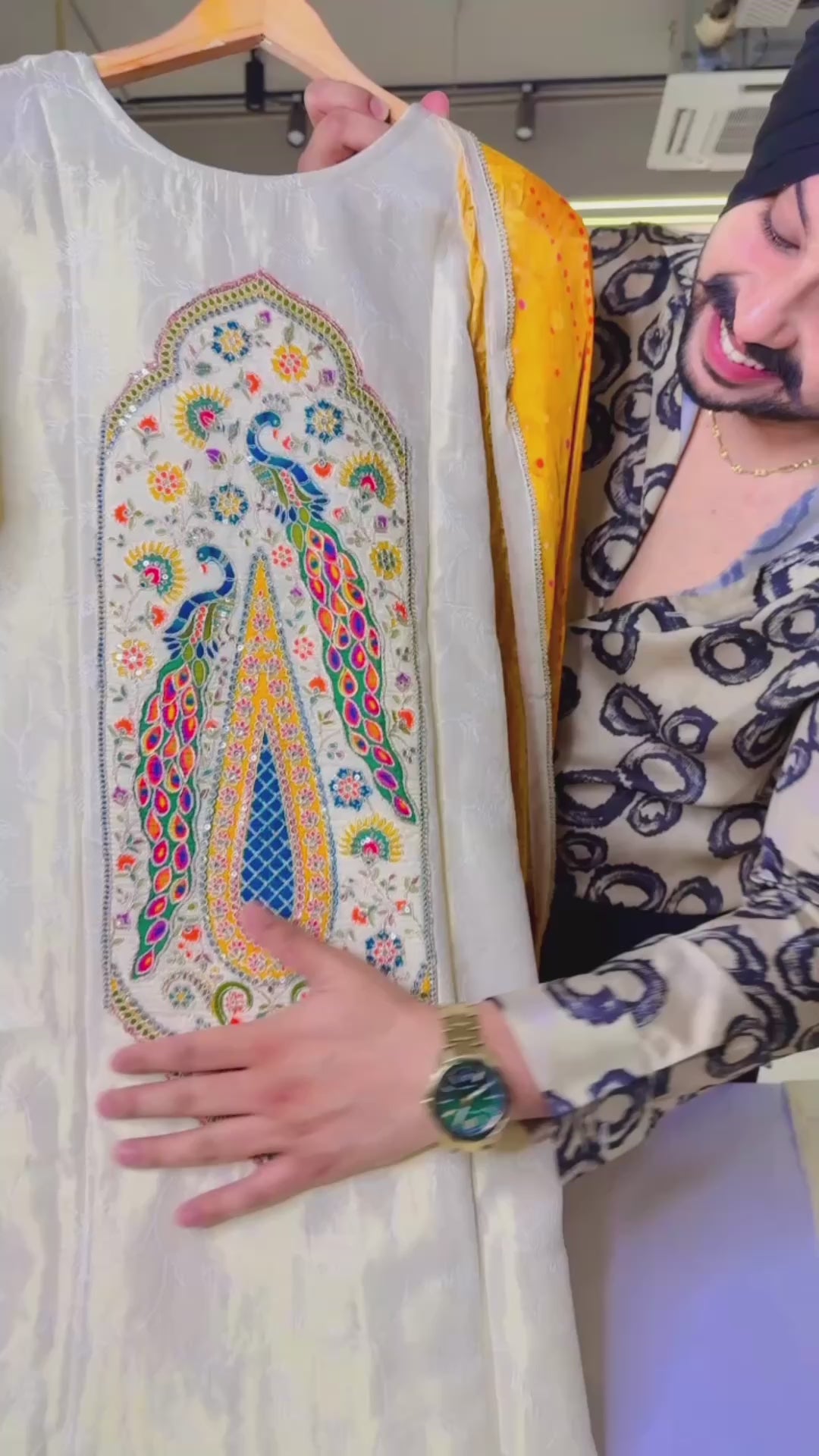 Ivory Gold Jacquard Silk Heavy Peacock Embroidered Straight Suit with Beautiful Silk Duppata