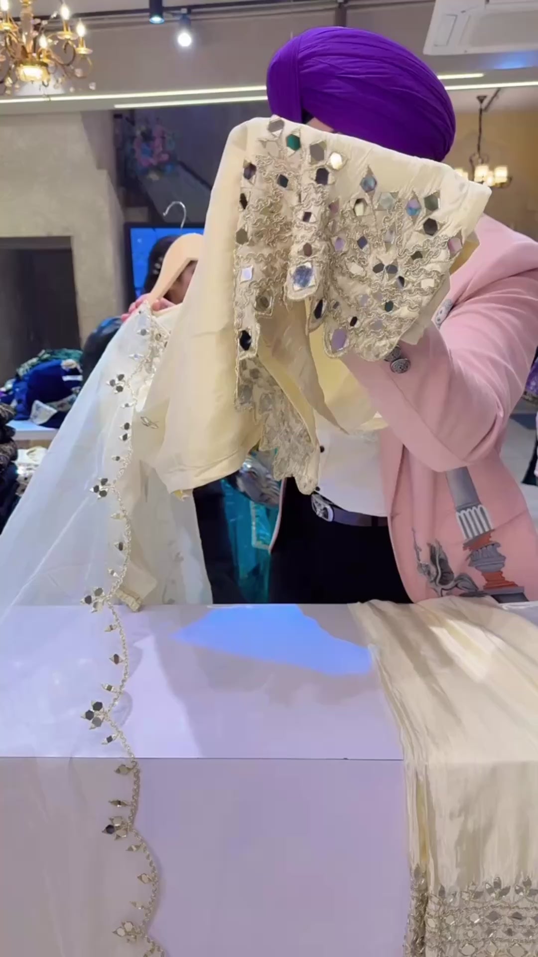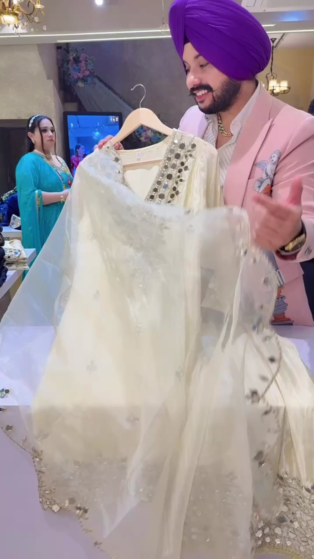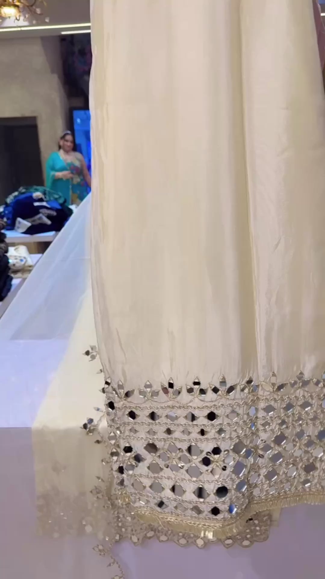 Off white Shimmer Silk Heavy Mirror Work Partywear Straight suit with Heavy Mirror work on Plazo & Duppata