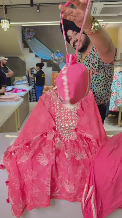 Gajri pink Fully embroidered Soft Organza Kaftan Coord set with Cute Potli