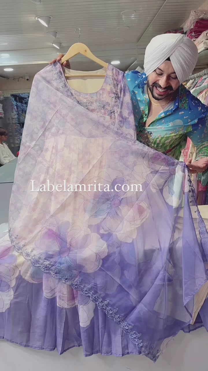 purple & Cream Chiffon Anarkali suit with Beautiful Embroidery Work on neck & organza Duppata