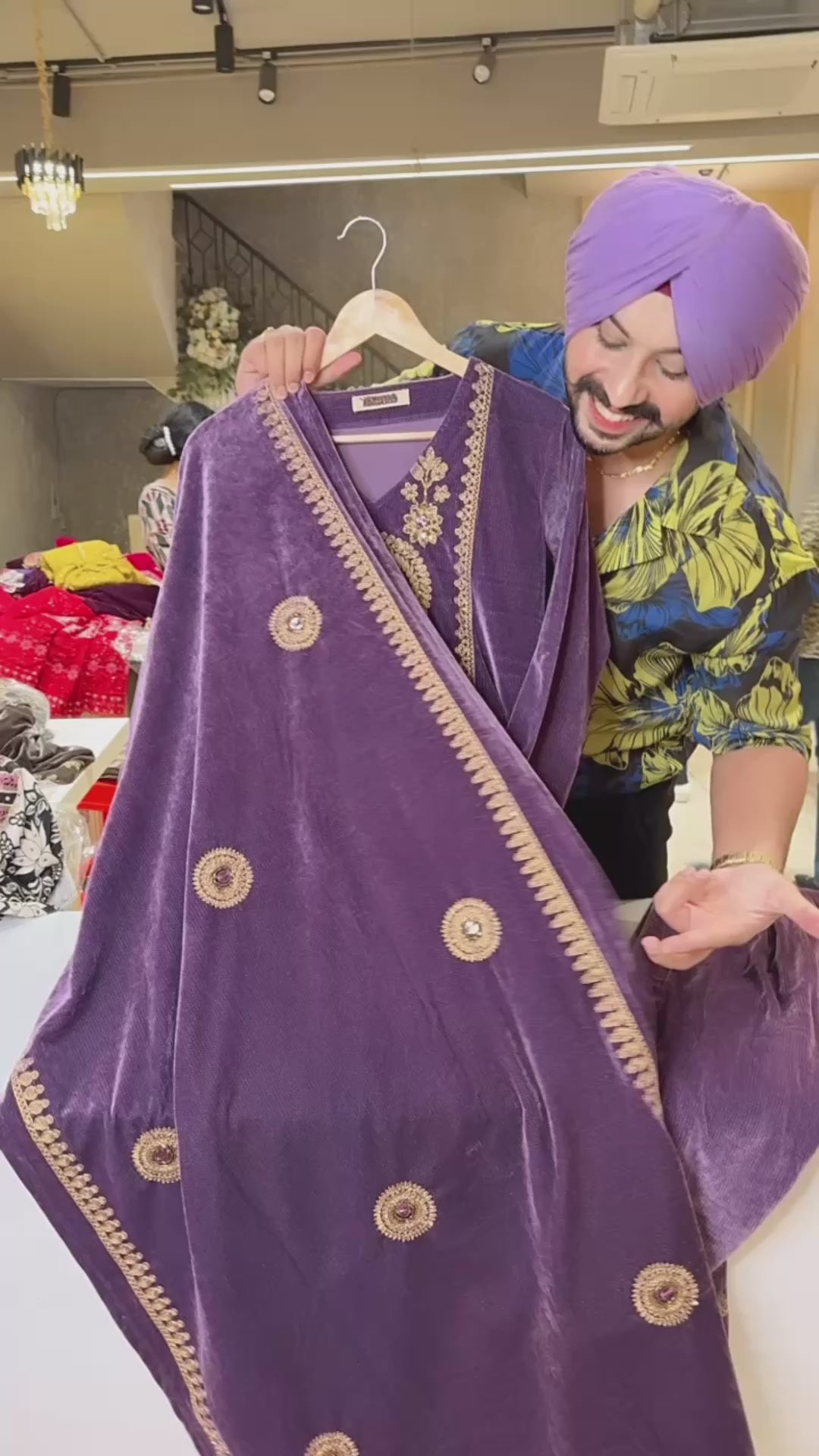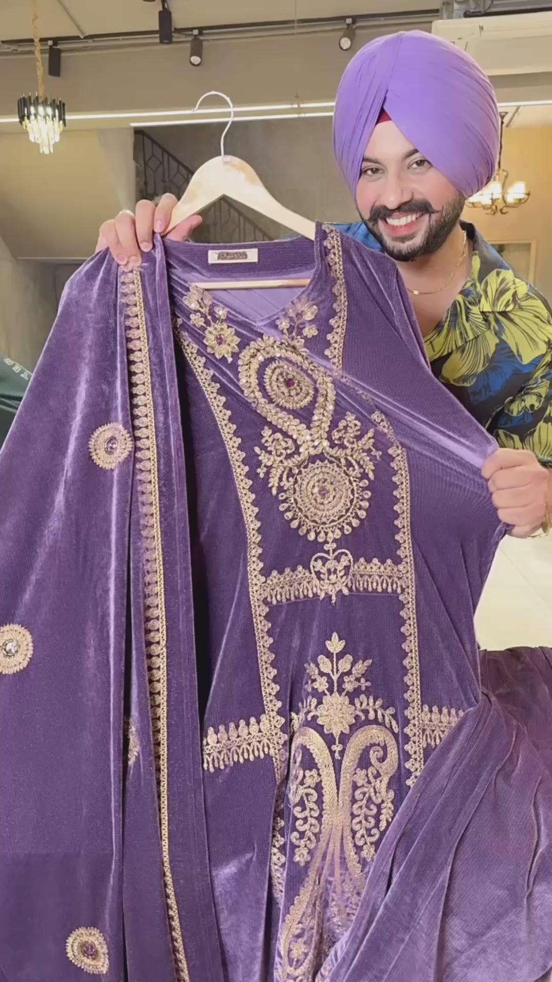Light purple cotrise Velvet Strechable Straight Heavy embroidered Suit