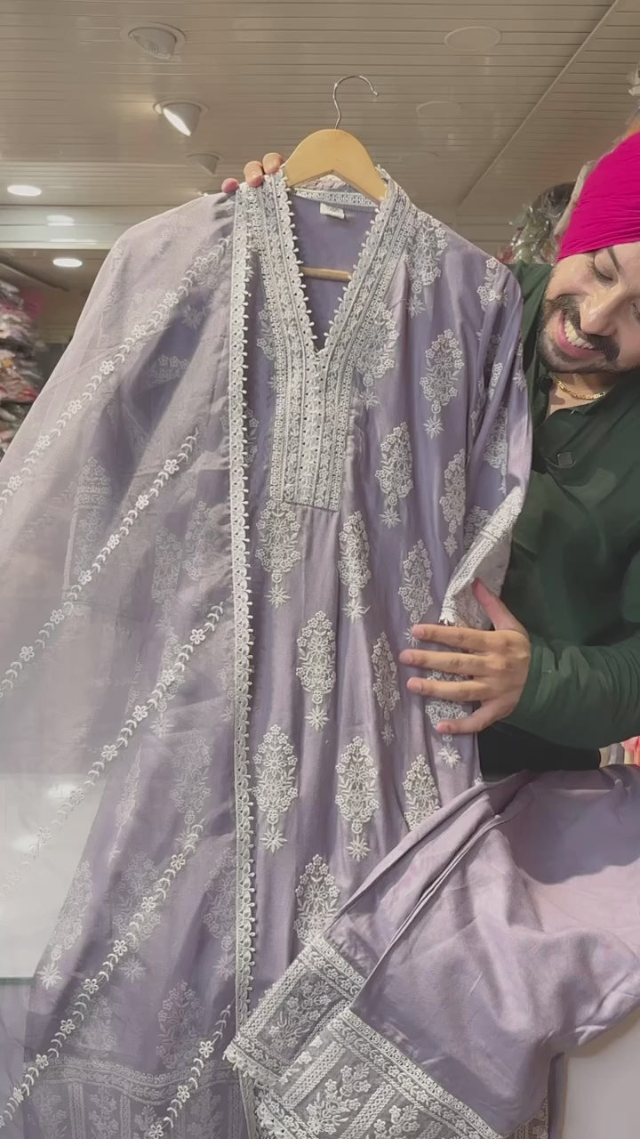 Lavender Rayon Embroidered Pakistani Suit with organza Duppata