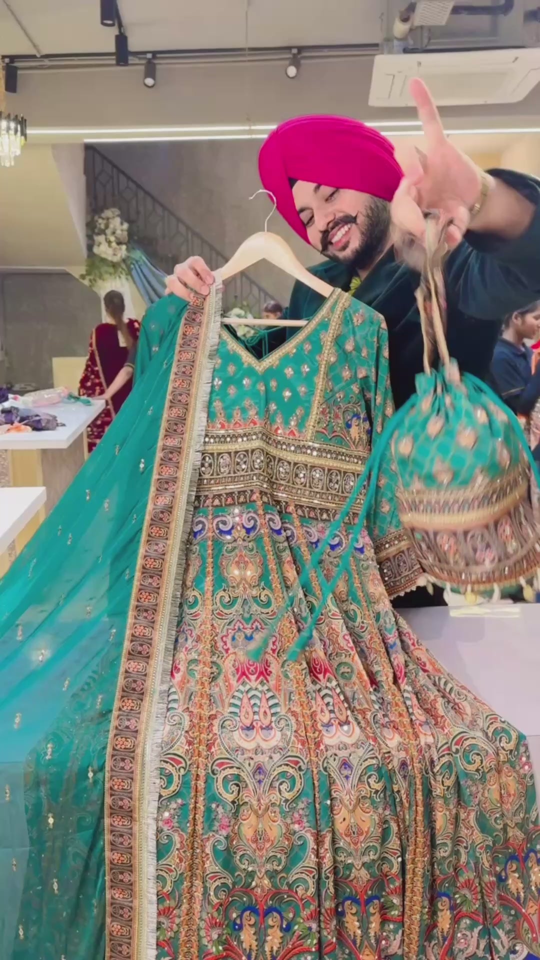 Leaf Green Crepe heavy embroidered Anarkali Gown with cute Potli & beautiful Duppata