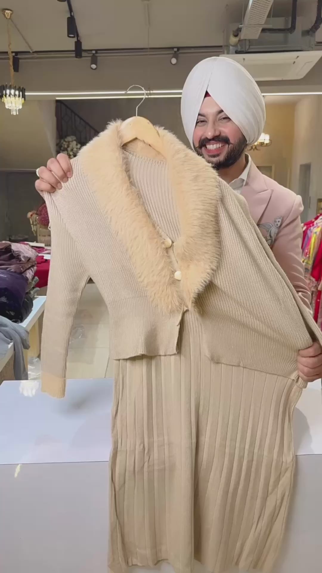 Light Beige Imported Strechable woolen Knee Length Dress with Woolen Furr jackets